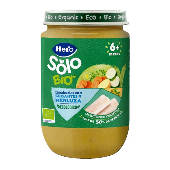 Hero Solo Bio Carottes avec Petits Pois et Merlu est un petit pot écologique conçu pour les bébés à partir de six mois. Cette purée contient plus de 50% de légumes et est élaborée avec des ingrédients 100% écologiques, ce qui en fait une option saine pour l'introduction de nouvelles saveurs naturelles dans l'alimentation infantile. De plus, c'est un produit sans gluten, idéal pour les plus petits.