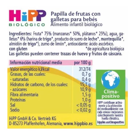 Pots de pommes et de bananes avec des biscuits. Idéal comme en-cas entre les repas ou comme dessert. Ils sont fabriqués avec des fruits 100% biologiques, sans OGM (Organismes Génétiquement Modifiés), conformément à la réglementation européenne sur la production biologique. Sans sucres ajoutés.