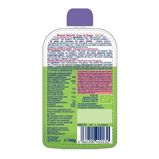 Poches Hipp Pêche Pomme et Fruits des Bois 100g est une option idéale pour que les plus petits profitent d'une collation saine. Ces sachets de purée de fruits sont élaborés exclusivement avec des ingrédients biologiques, garantissant un goût authentique et naturel.