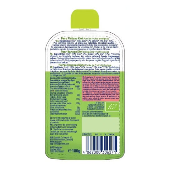Sachets de purée de fruits avec composition écologique. Aliment infantile spécialement développé pour être consommé comme snack.