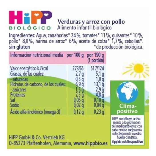 Pot de légumes bio préparé pour l'alimentation des bébés à partir de 4 mois. Il contribue à nourrir et à alimenter les petits, avec une composition facile à digérer et sans gluten, sans lait ni sucres ajoutés. Contient 45% de purée de légumes, riz cuit, viande de poulet, tomates, carottes, oignons, huile végétale, petits pois et eau de cuisson. C'est une source de fibres alimentaires, de protéines végétales et de glucides, qui favorisent le bon développement des enfants en pleine croissance. C'est un produit sans OGM. Il offre un goût naturel agréable et une texture crémeuse. Avec des ingrédients 100% biologiques.