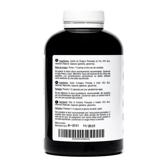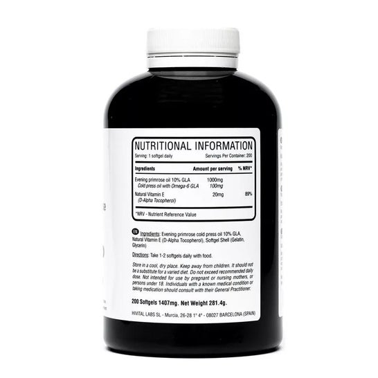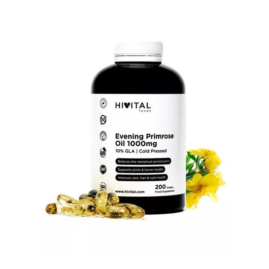 Hivital Foods Huile d'Onagre 1000 mg est un complément alimentaire fabriqué à partir d'huile d'Onagre 100% Naturelle pressée à froid avec 10% de l'ingrédient actif GLA (Acide Gamma-Linolénique à 10 mg), responsable des propriétés thérapeutiques du produit. S'ajoute 20 mg de Vitamine E Naturelle, un puissant antioxydant qui pénètre les membranes cellulaires et les protège des dommages oxydatifs. 100% naturel, sans gluten, sans lactose, sans soja, sans stéarate de magnésium, sans sucre, sans conservateur ni colorant, sans arôme ajouté, non transgénique (sans OGM).