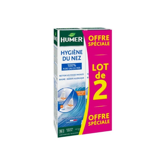 Humer Hygiène Nez Solution Saline Spray 2x150 ml est un produit conçu pour l'hygiène nasale et comme traitement complémentaire pour les rhumes et la rhinite allergique. Sa fonction principale est d'humidifier le mucus sec et de faciliter la fluidification des sécrétions nasales, ce qui permet un nettoyage doux du nez et facilite le processus de se moucher.