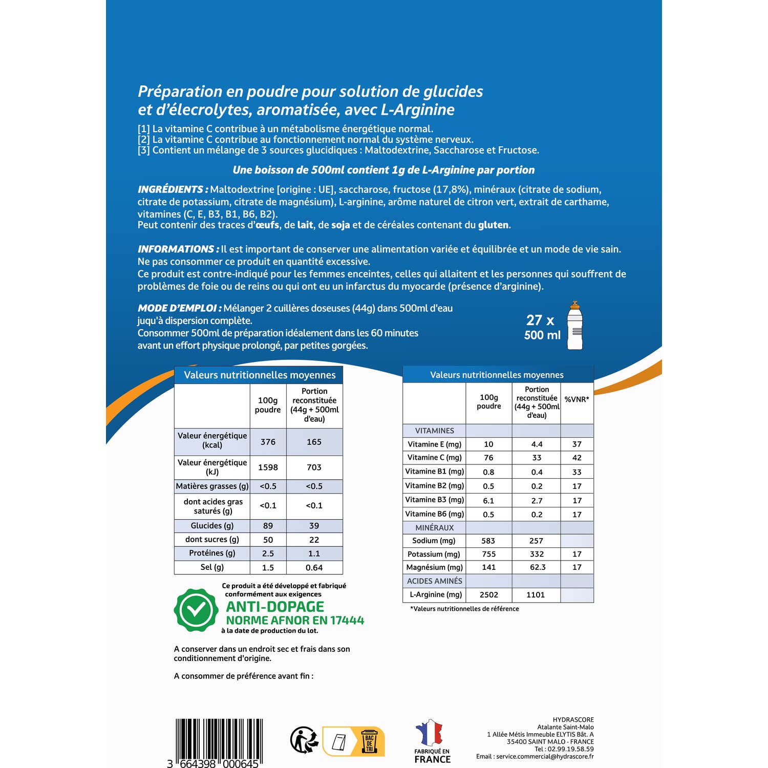 Elle apporte 3 électrolytes, 6 vitamines, un apport glucidique et l’acide aminé L-Arginine.
