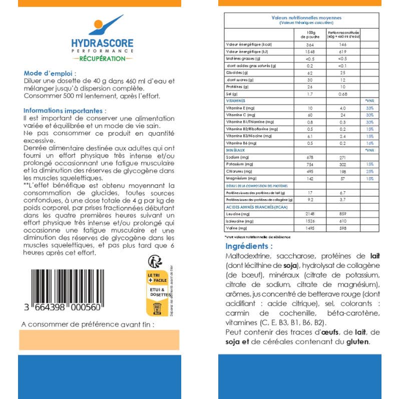 Formulé à base de 4 minéraux, 6 vitamines, un apport de glucides et de BCAA, acides aminés ramifiés (L-Leucine, L-Isoleucine, L-Valine), qui apportent les glucides nécessaires pour restaurer les réserves énergétiques et contribuent à maintenir la masse musculaire grâce à son apport de protéines de haute qualité avec un aminogramme spécifique.