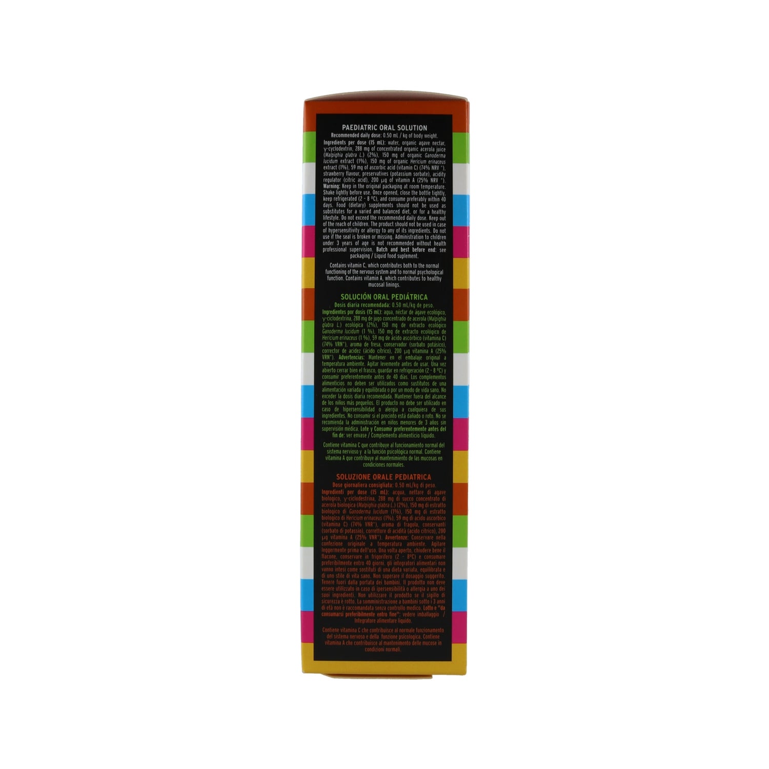 Complément alimentaire au format liquide, développé pour les plus jeunes, qui agit sur l'axe intestin-cerveau et améliore la santé digestive et immunitaire en apportant des prébiotiques qui contribuent à équilibrer le microbiote intestinal. Contient des extraits de champignons médicinaux reishi et lion's mane, et est enrichi en vitamines A et C.