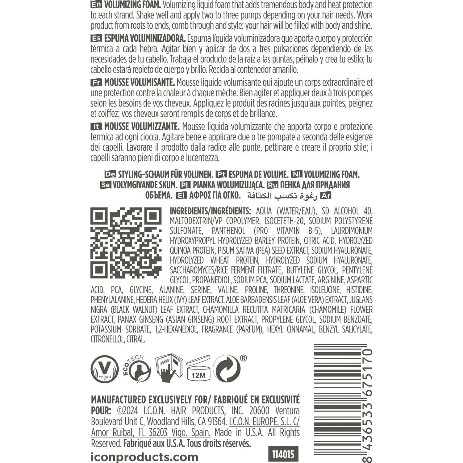 I.C.O.N. Body Mousse Volumatrice 177ml est un produit conçu pour apporter un volume et une plénitude exceptionnels aux cheveux. Cette mousse est élaborée avec un riche mélange de :