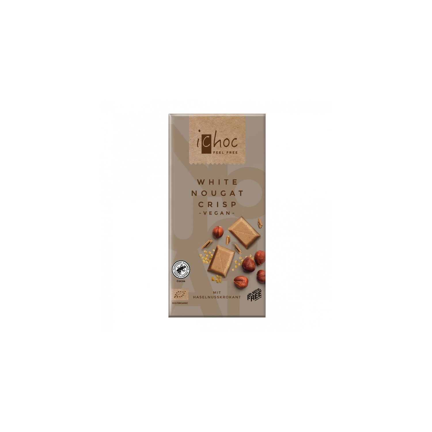 Chocolat blanc avec nougat aux noisettes. Saveur douce et crémeuse de chocolat blanc avec du vrai nougat. Avec du sucre de canne complet. Fabriqué avec des ingrédients issus de l'agriculture biologique. Le conchage intense développe les riches arômes de cacao et la texture fine. Peut contenir des traces de fruits à coque, lait, soja et dérivés.