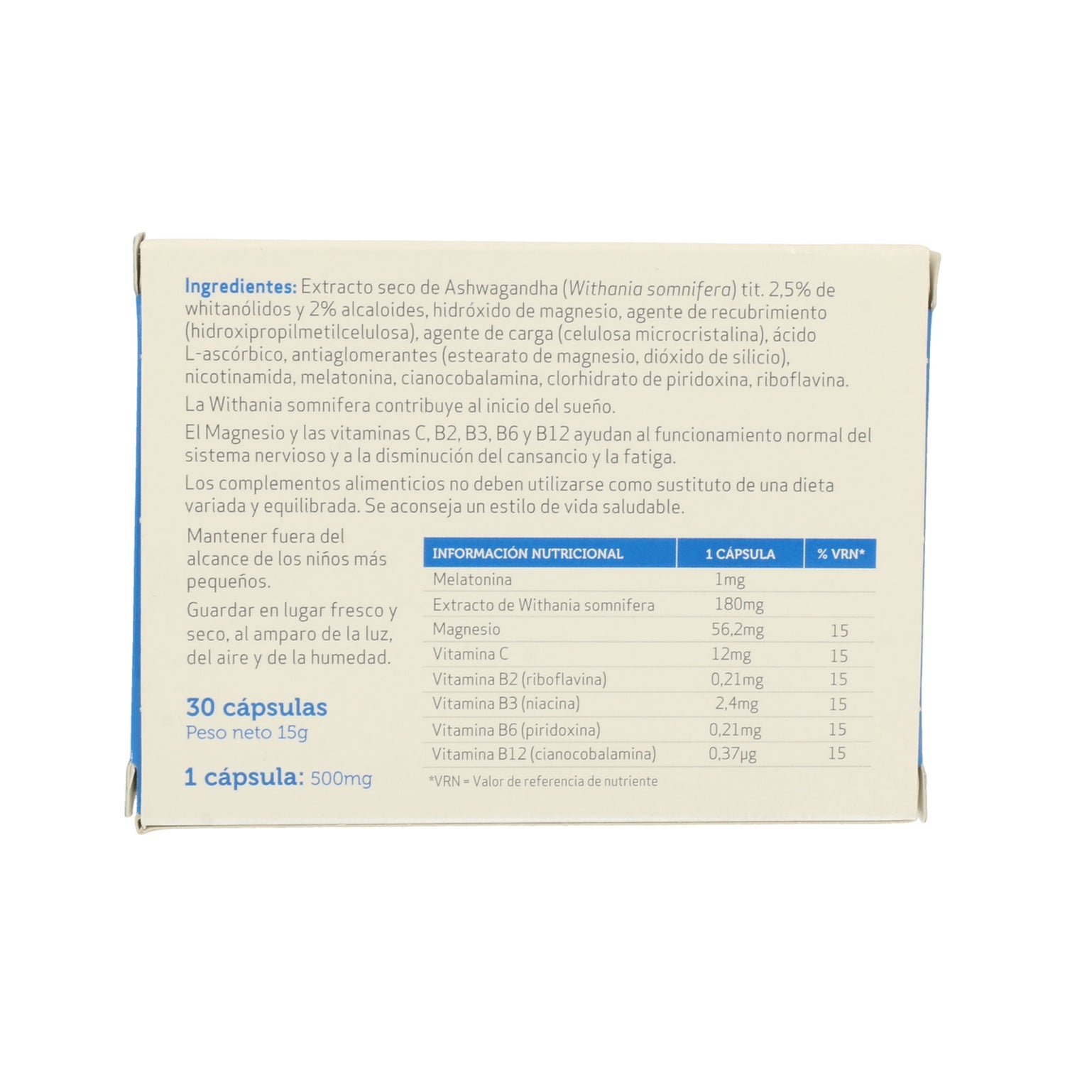 Complément alimentaire sous forme de gélules à base de mélatonine et d'ashwagandha, qui est indiqué pour aider à réduire le temps d'endormissement. Il contient également du magnésium et des vitamines B et C, qui aident le système nerveux à fonctionner normalement et réduisent la fatigue et la lassitude.