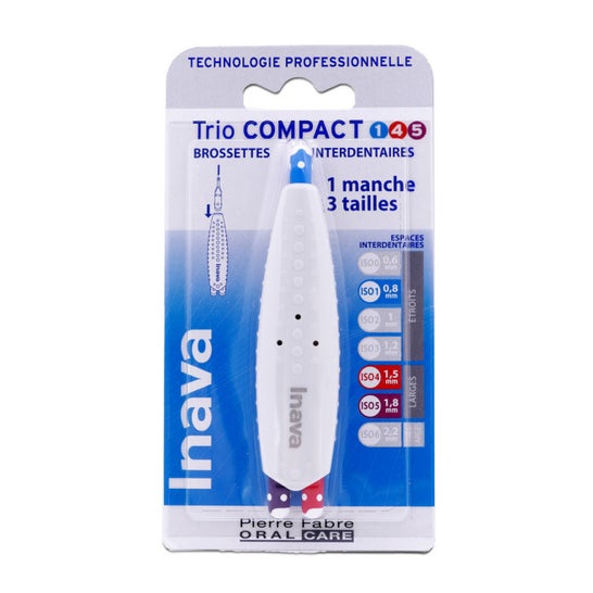 Son format compact et sa variété de tailles permettent d'accéder facilement aux zones les plus difficiles de la bouche. Le design innovant de Inava Trio Compact Brosse Interdentaires 1/4/5 facilite l'élimination des résidus alimentaires et de la plaque bactérienne, là où la brosse à dents conventionnelle ne peut pas atteindre.