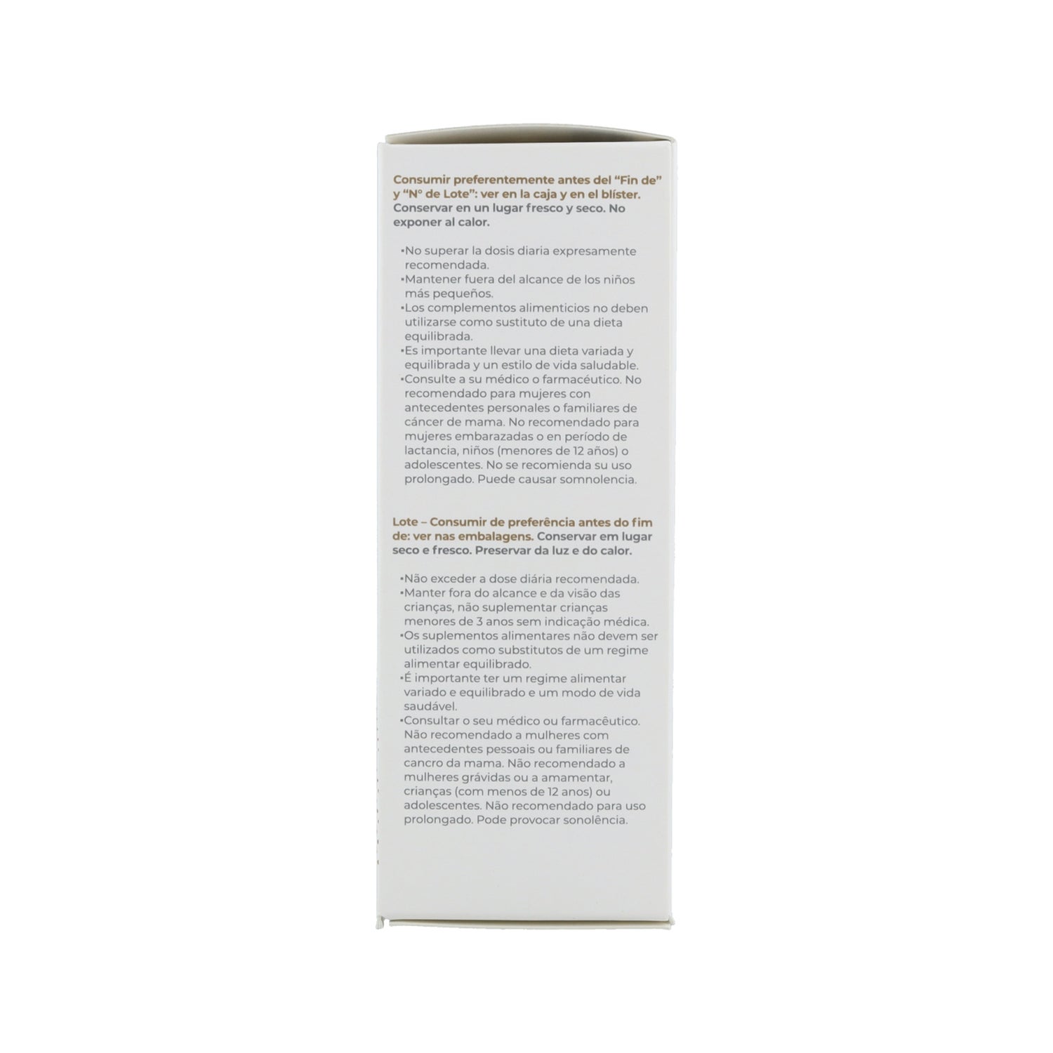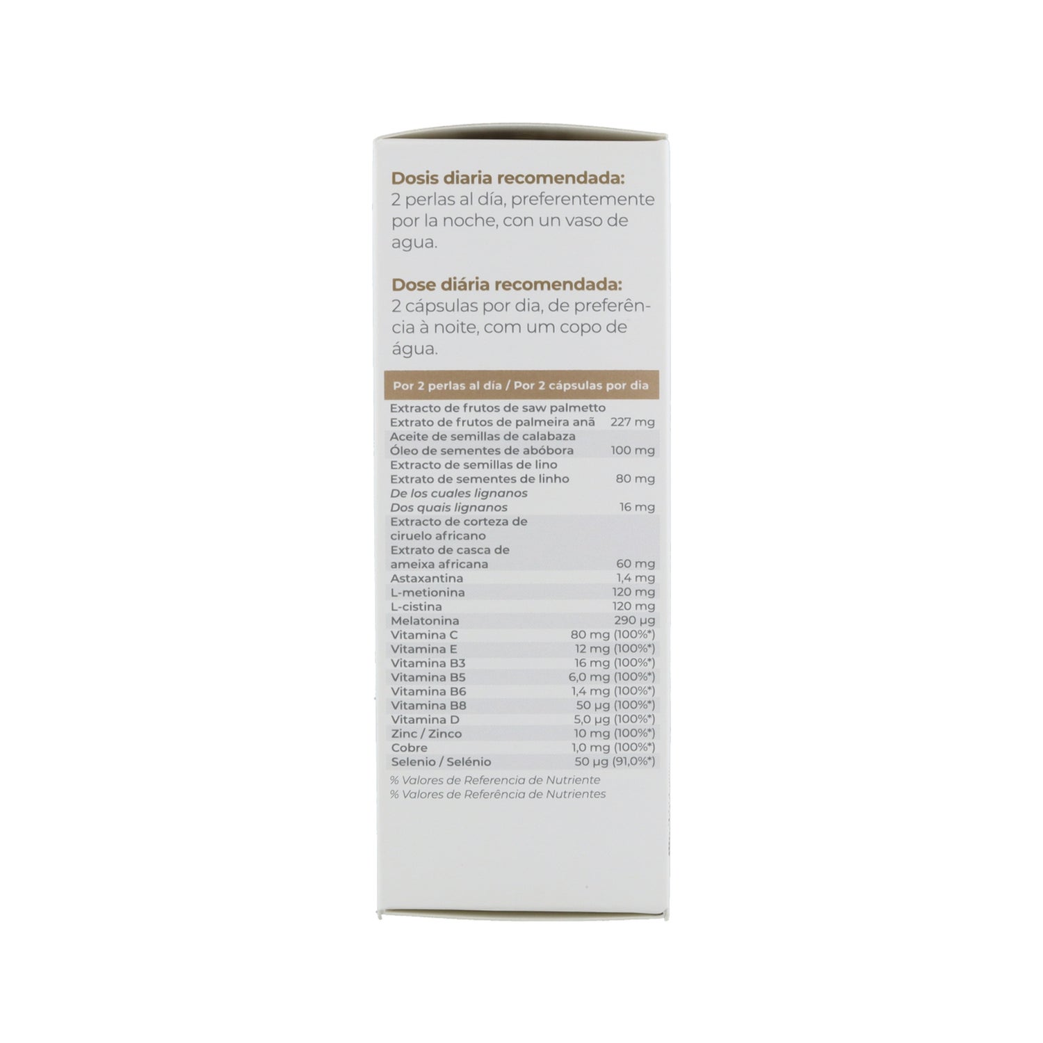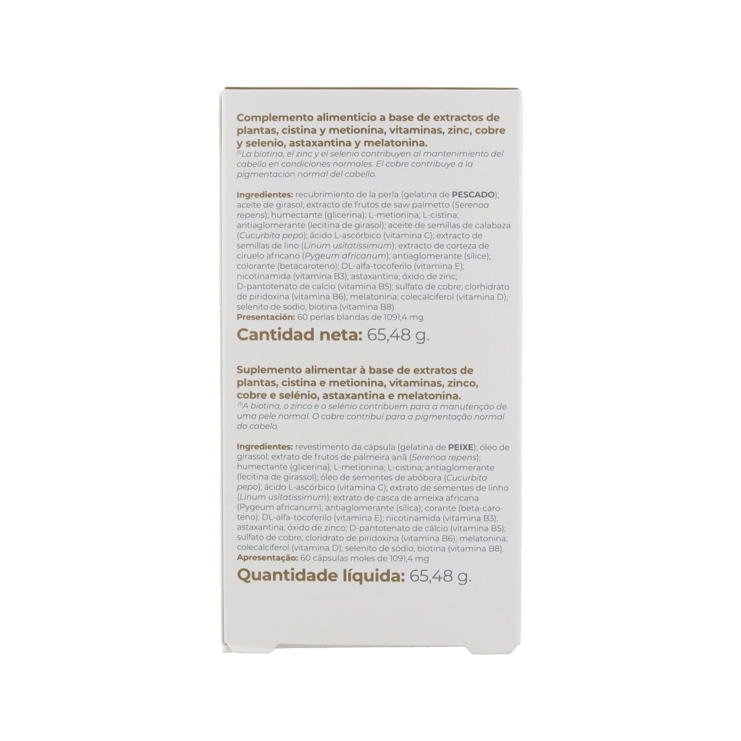 Émulsifiant (huile de tournesol (Helianthus annuus L.)); tunique de poisson (gélatine de poisson); extrait de saw palmetto (Serenoa serrulata (Michx.) Nichols.); humectant (glycérine); L-méthionine; L-cystine; anti-agglomérant (lécithine de tournesol); extrait d’huile de graines de courge (Curcubita pepo L.); vitamine C (acide ascorbique); extrait de graines de lin (Linum usitatissimum L.); extrait de pygeum africanum (Prunus africana (Hook. f.) Kalkman); silice colloïdale; colorant bêtacarotène; vitamine E (D-alpha-tocophérol); vitamine B3 (nicotinamide); AstaReal® 10% astaxanthine (Haematococcus pluvialis J. Von Flotow); oxyde de zinc; vitamine B5 (D-panthothénate de calcium); sulfate de cuivre; vitamine B6 (clorhydrate de pyridoxyne); mélatonine; vitamine D3 (cholecalciferol); sélénite de sodium; vitamine B8 (biotine). Allergène : poisson.