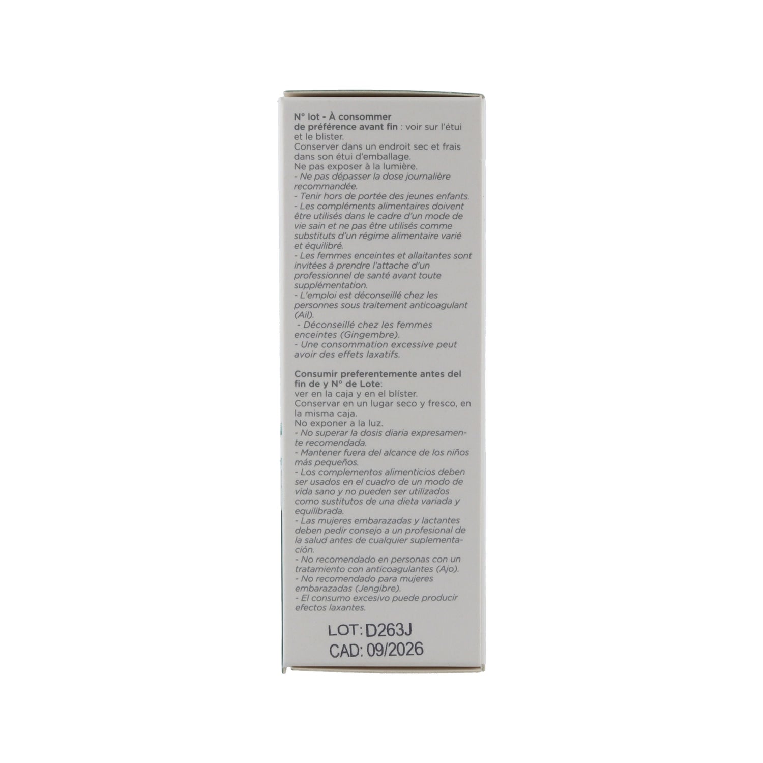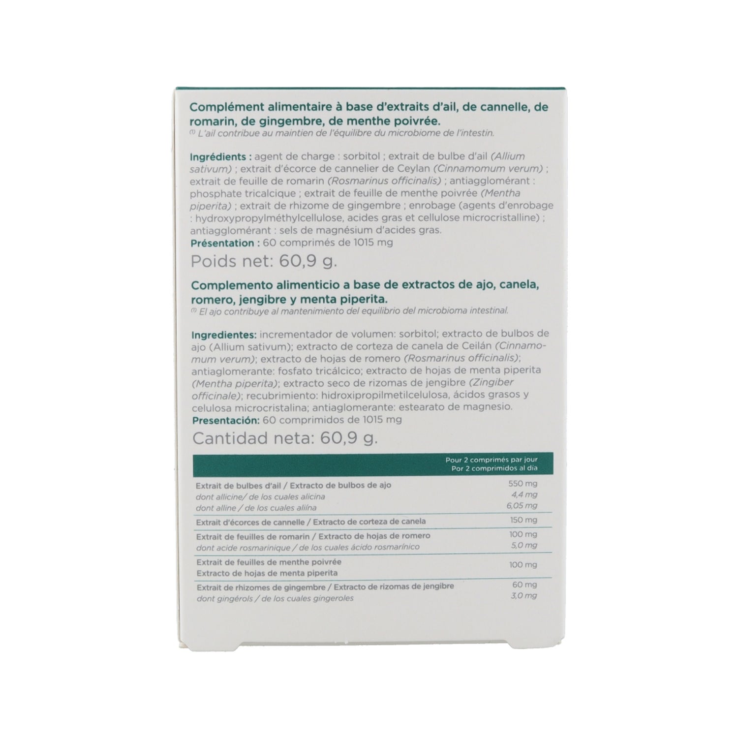 La composition contient : extrait sec de bulbes d'ail, extrait sec d'écorce de cannelle, feuilles de romarin, racines de gingembre et feuilles de menthe.