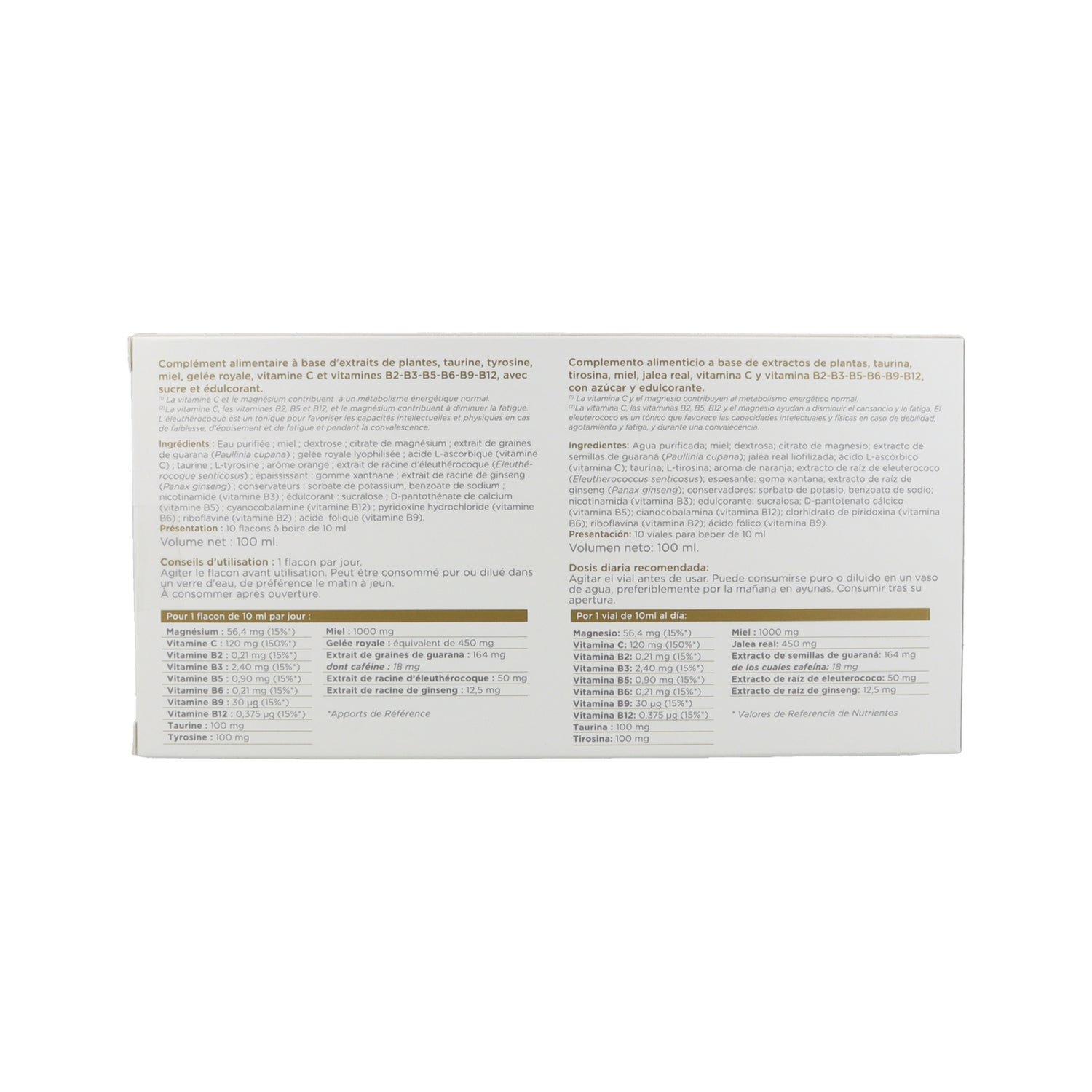 Sa formule à base d'extraits de plantes (éleuthérocoque, ginseng, guarana), taurine, tyrosine, miel, gelée royale, vitamine C et les différentes vitamines du groupe B, favorise le tonus psychologique et physique.