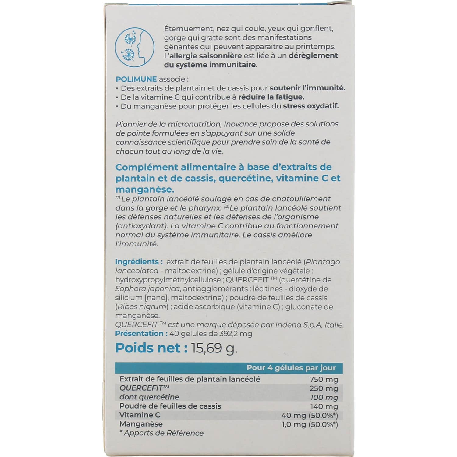 - Quercétine sous forme phytosomique : garantit une biodisponibilité optimale.