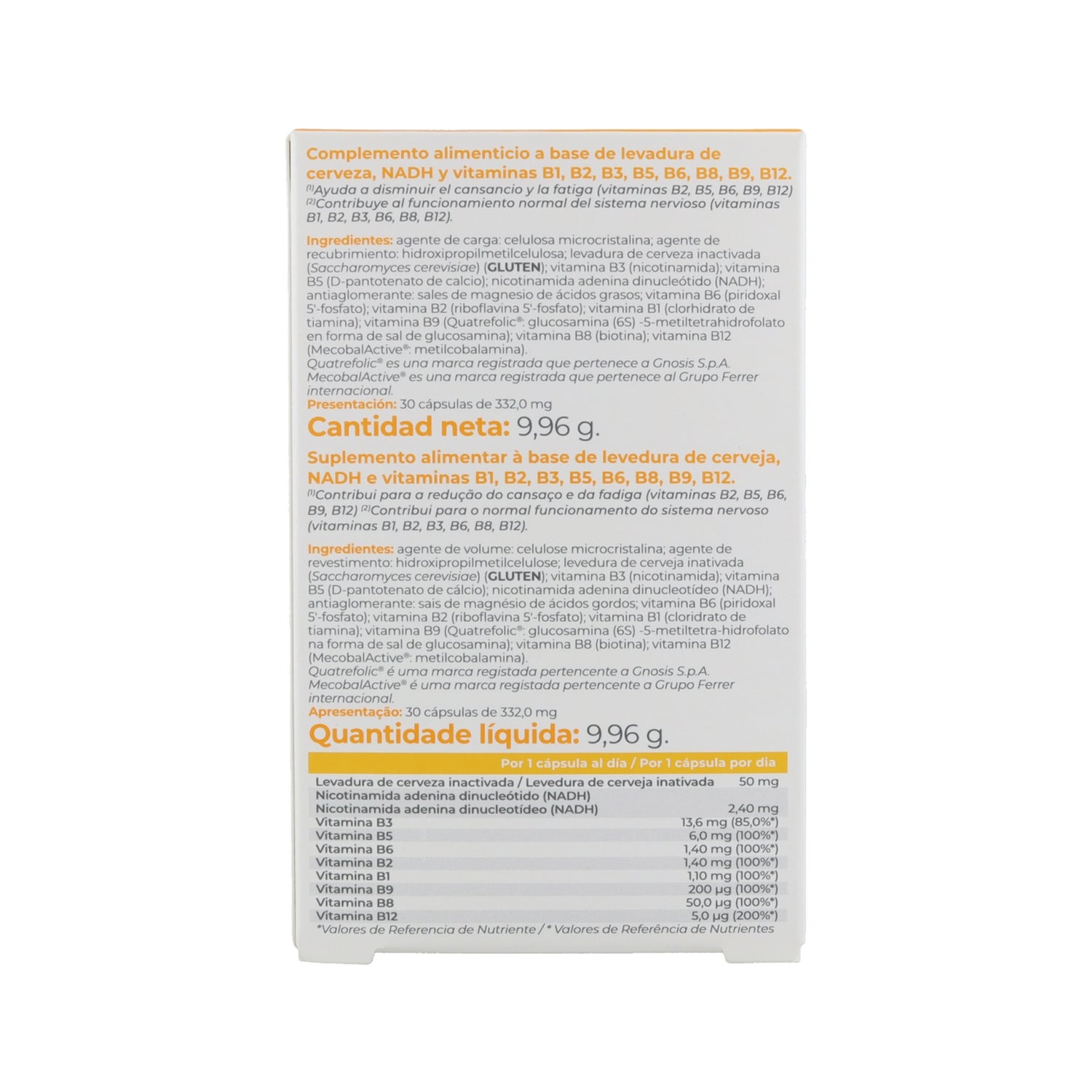 Un complément alimentaire à base de levure de bière, de NADH et de vitamines B qui contribue à renforcer le système nerveux. Les vitamines B apportent à l'organisme des propriétés bénéfiques qui permettent de prévenir les problèmes d'hyperhomocystéinémie et de risque cardiovasculaire, de fatigue et d'anémie, de troubles émotionnels et de déficience cognitive, entre autres.
