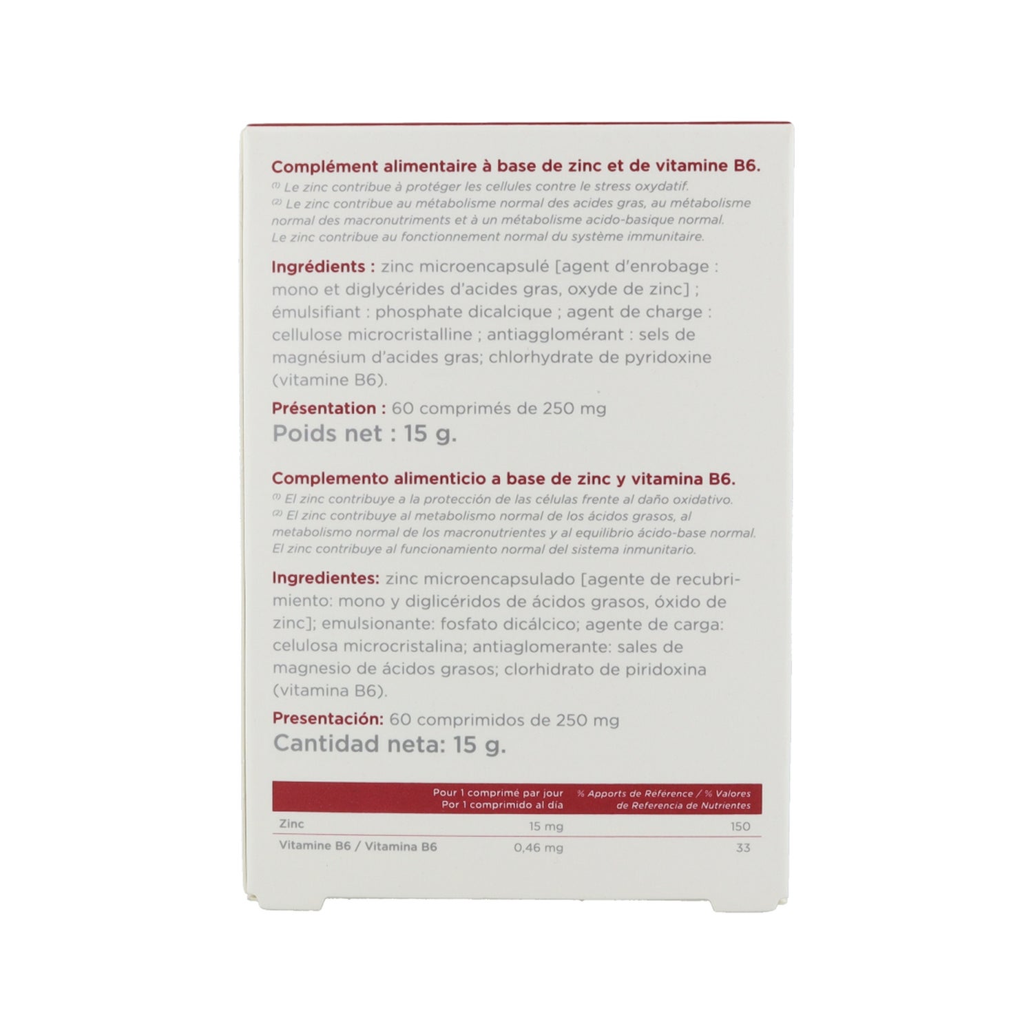 Complément alimentaire à base de zinc et de vitamine B6, spécialement formulé pour favoriser la protection des cellules et agir sur l'équilibre métabolique. Le zinc est nécessaire au bon fonctionnement du système immunitaire. Elle est également impliquée dans la division et la croissance des cellules, la cicatrisation des plaies et le métabolisme des glucides. Le zinc est également nécessaire pour les sens de l'odorat et du goût.