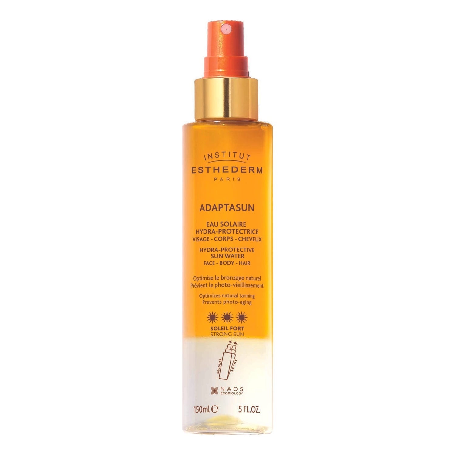 Institut Esthederm Adaptasun Eau Solaire Hydra-Protectrice Soleil Fort Spray 150ml est une eau de soin qui protège du soleil et du photo-vieillissement tout en hydratant la peau en un seul geste.