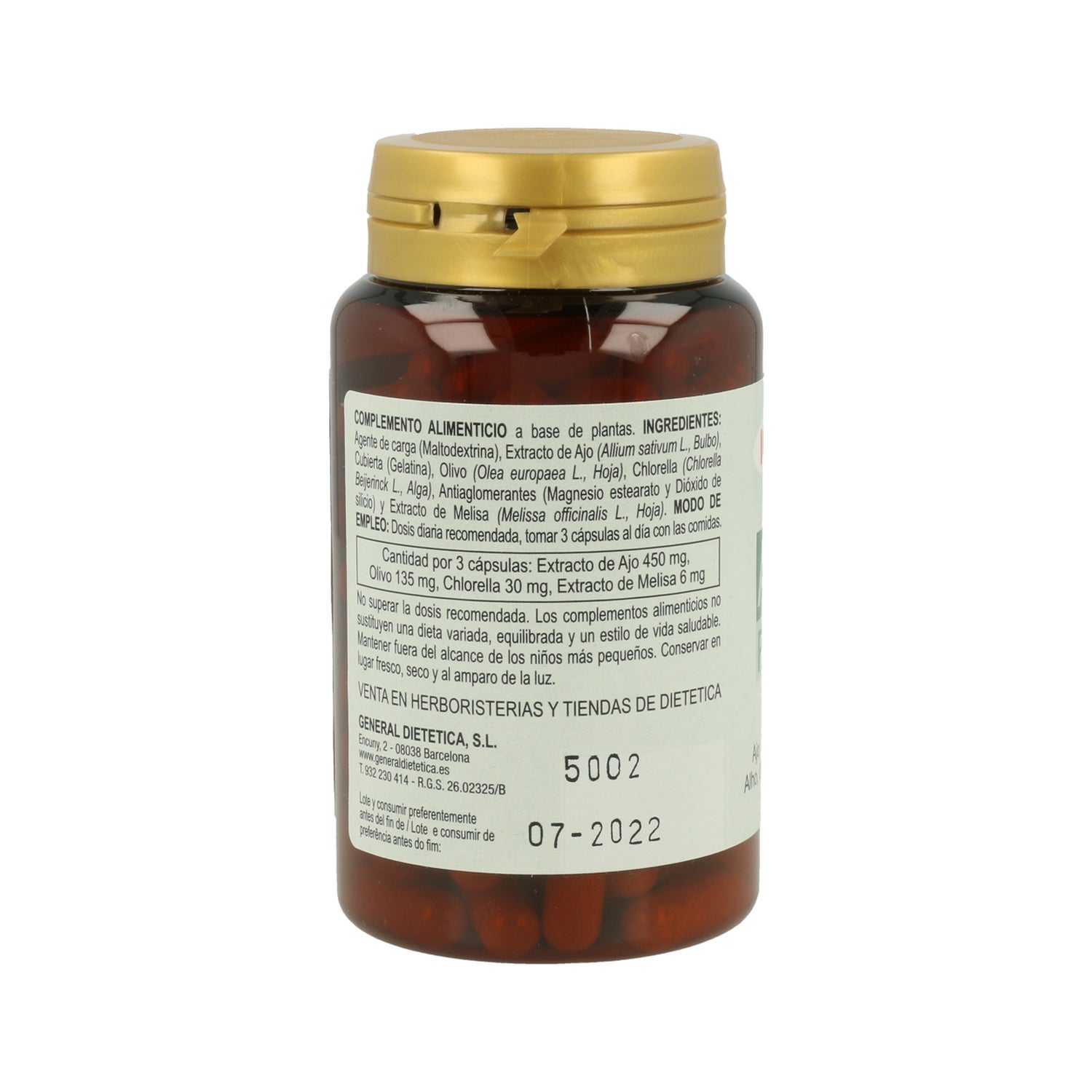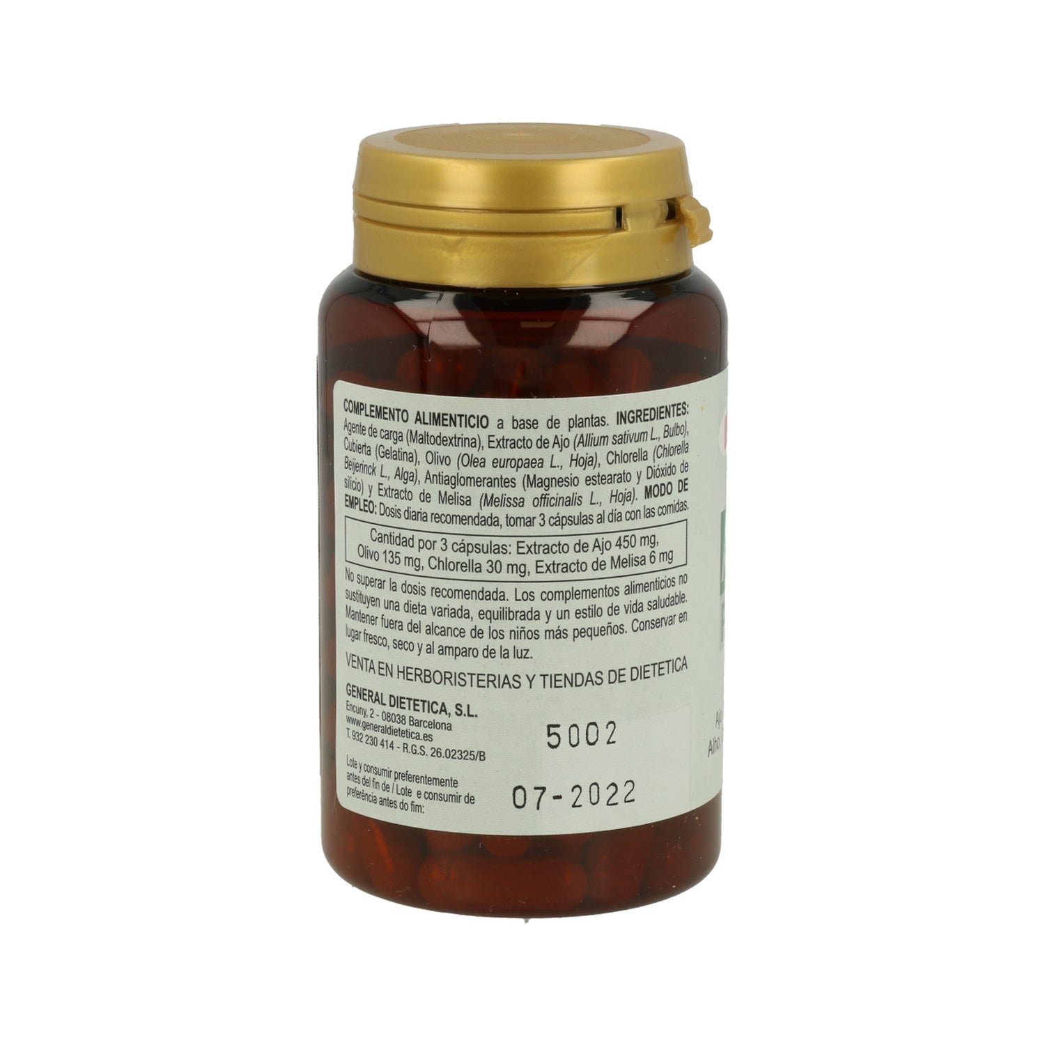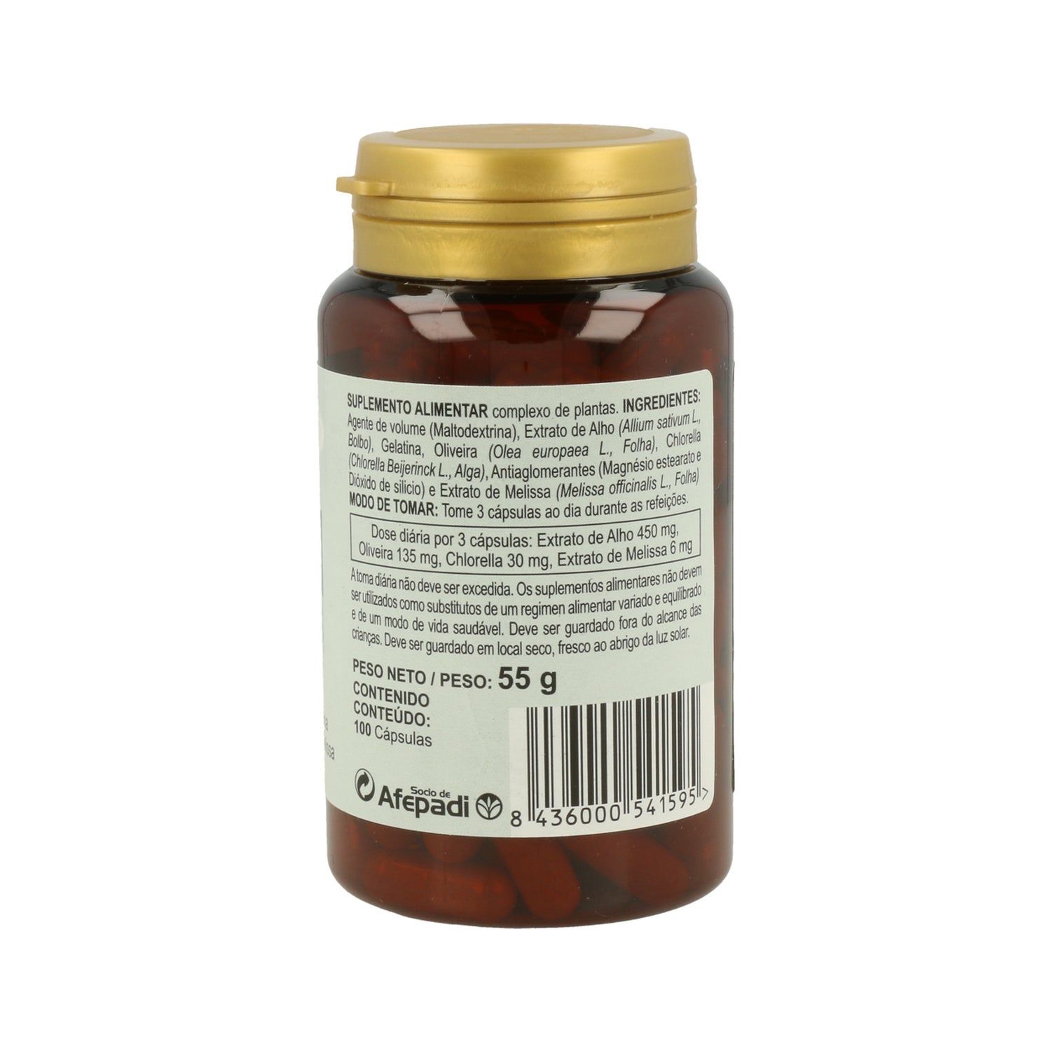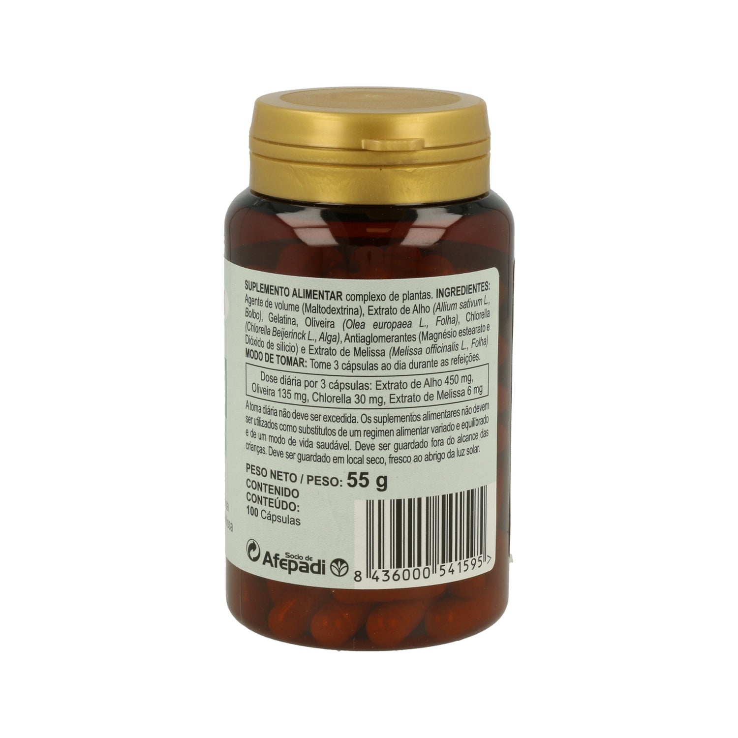 Capsules à base d'ail, d'olive, de chlorelle et de mélisse qui contribuent à améliorer le système circulatoire et à réduire le risque de maladies cardiovasculaires. Elles préviennent le vieillissement prématuré des cellules et renforcent le système immunitaire.