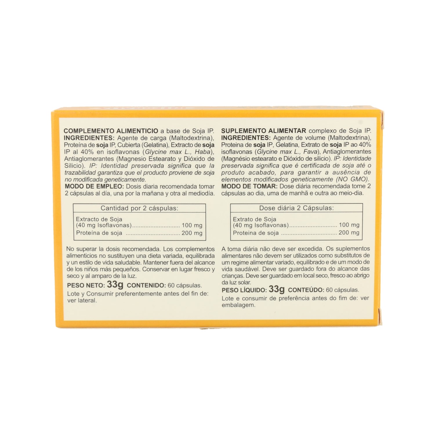 Par 2 gélules : 100 mg d'extrait de soja IP (40% d'isoflavones). 200 mg de protéines de soja IP.