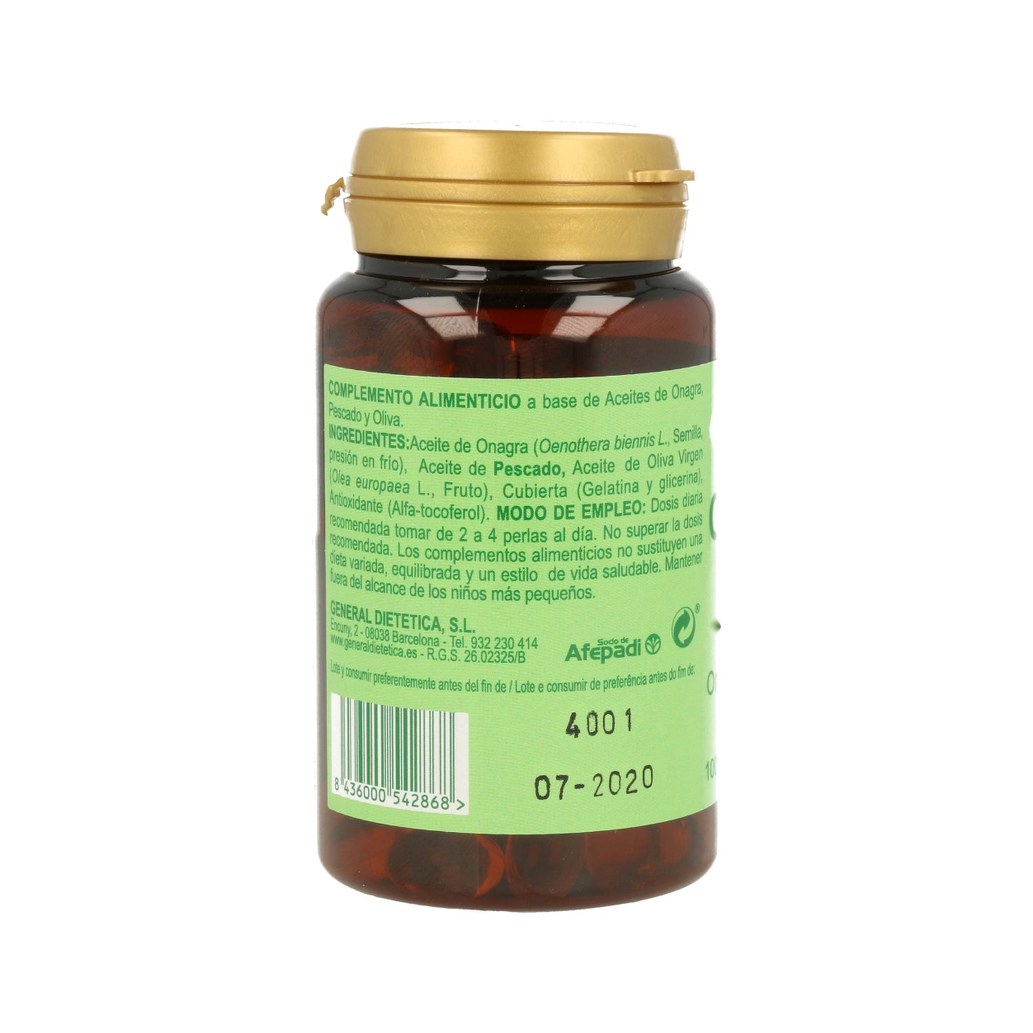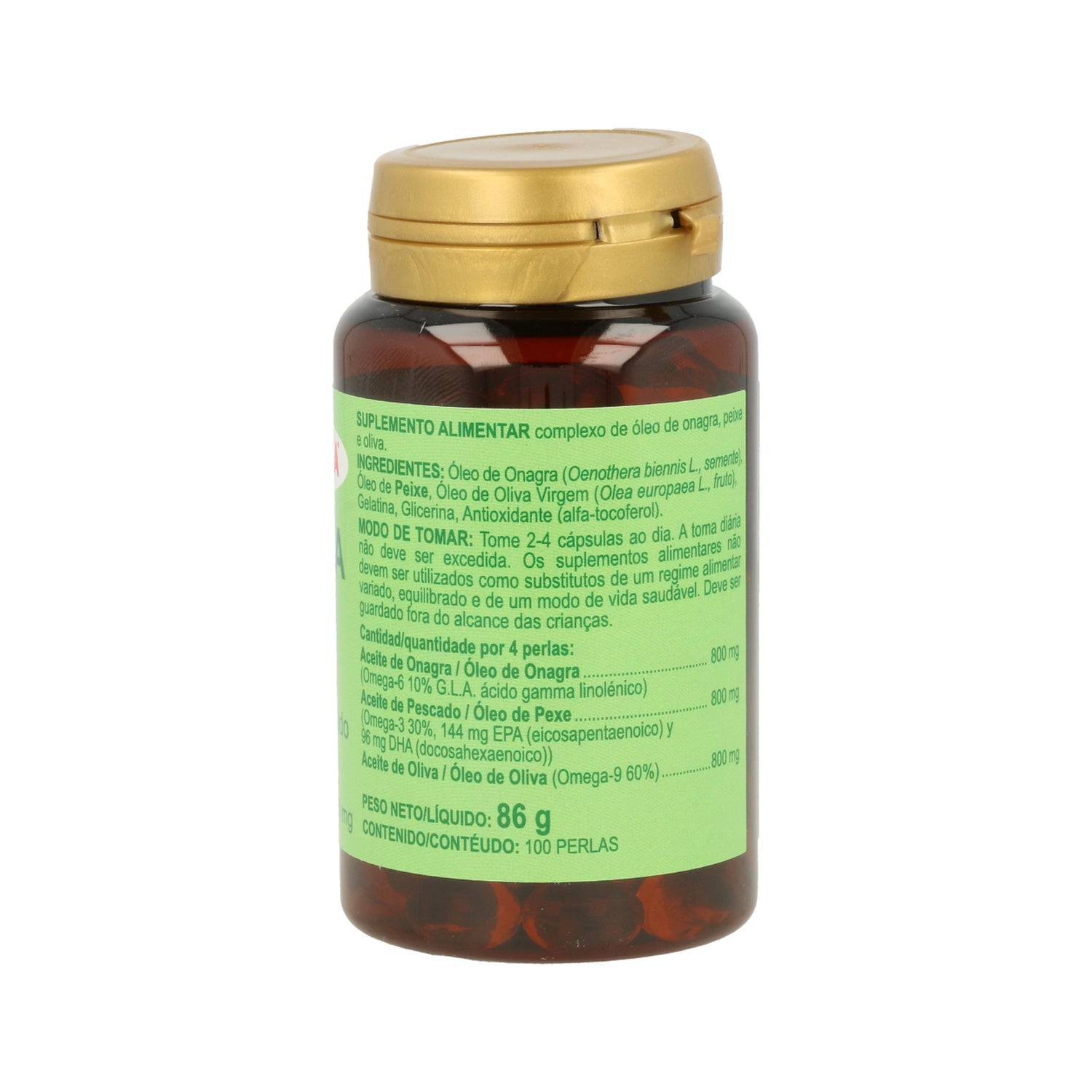 Complément alimentaire sous forme de perles souples, à base d'huiles de poisson, d'onagre et d'olive, qui apportent une grande quantité d'acides gras oméga 3, 6 et 9. Il contribue à la bonne santé du système circulatoire et cardiovasculaire, aide à protéger la vue, renforce le système immunitaire et prévient les douleurs articulaires, entre autres. Il est également très bénéfique pour la peau et les cheveux, et aide à réguler le cholestérol.