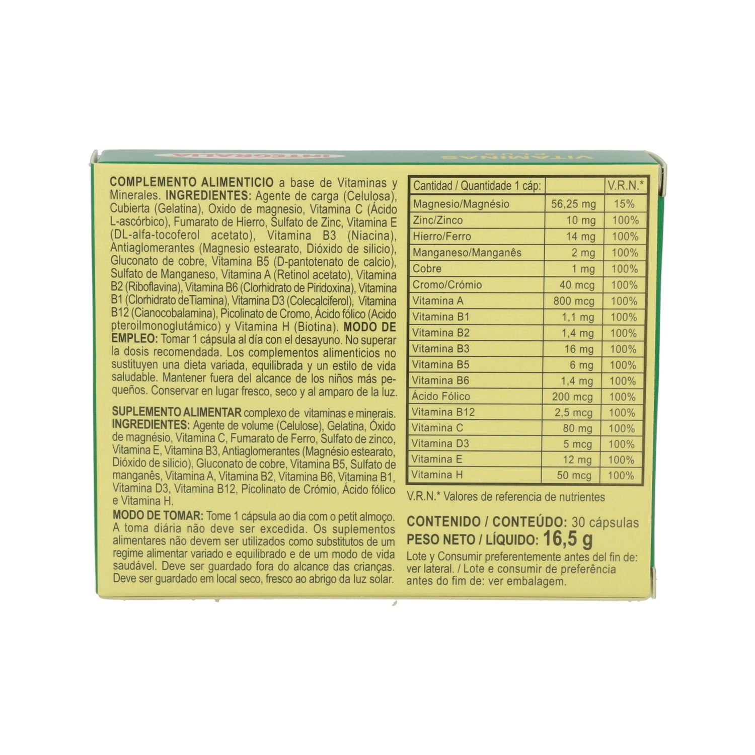 Supplément nutritionnel qui fournit des vitamines et des minéraux pour le bon fonctionnement de l'organisme. Les vitamines sont des composés organiques nécessaires au maintien d'une bonne santé et à l'intégrité des processus métaboliques. Leur principale fonction est de participer au contrôle du métabolisme énergétique, minéral et des principes immédiats, bien que certains d'entre eux aient des activités spécifiques. Ne pas dépasser la dose recommandée. Les compléments alimentaires ne remplacent pas une alimentation variée et équilibrée et un mode de vie sain. Tenir hors de portée des jeunes enfants. Conserver dans un endroit frais et sec, à l'abri de la lumière.