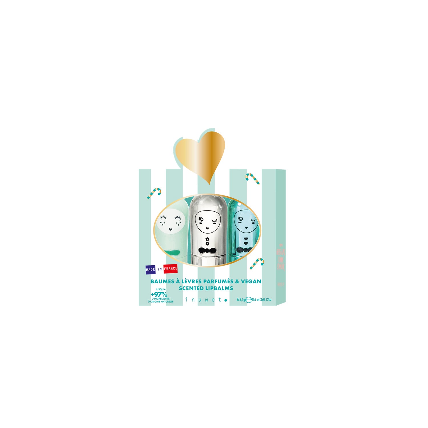 Inuwet Jingle Trio Baume à Lèvres Pomme Coco Cupcake est un ensemble qui comprend trois baumes à lèvres parfumés : Pomme, Coco et Cupcake. Ces baumes sont conçus pour fournir une hydratation aux lèvres tout au long de l'année.