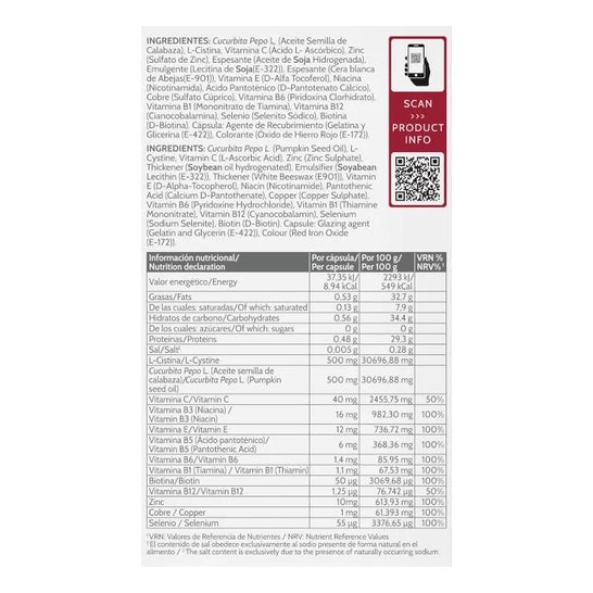 L-cystine, courge (cucurbita pepo L.), sélénium (sélénite), lécithine de soja (A), l-méthionine (AA), soja (glycine soja) (A), taurine, huile de graines de courge, huile de soja (A), glutathion.