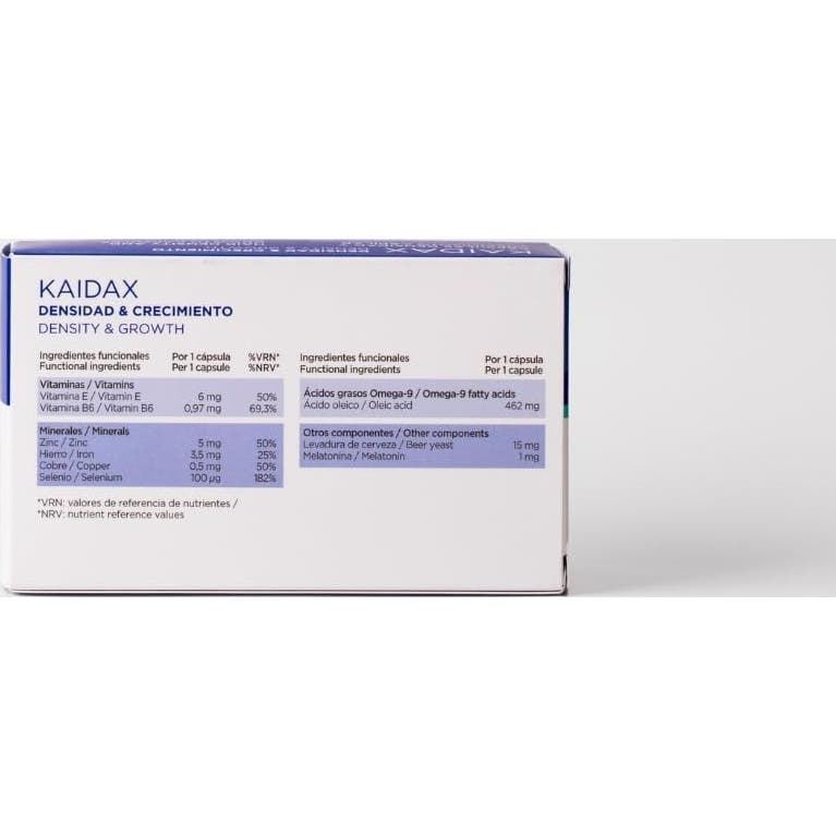 Kaidax Densité & Croissance 60 Capsules est un complément alimentaire conçu pour renforcer les cheveux, leur apporter du volume, de la brillance et un aspect sain. Ce produit contribue également à protéger la fibre capillaire du stress oxydatif.