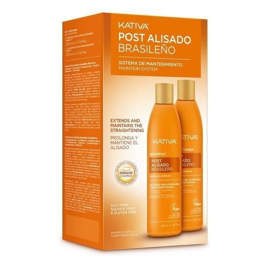 Kativa Post Lissage Brésilien Kit 2uds est un traitement conçu pour prolonger l'effet du lissage. Ce kit, qui ne contient pas de sel, est formulé pour être utilisé avec tout type de lissage.