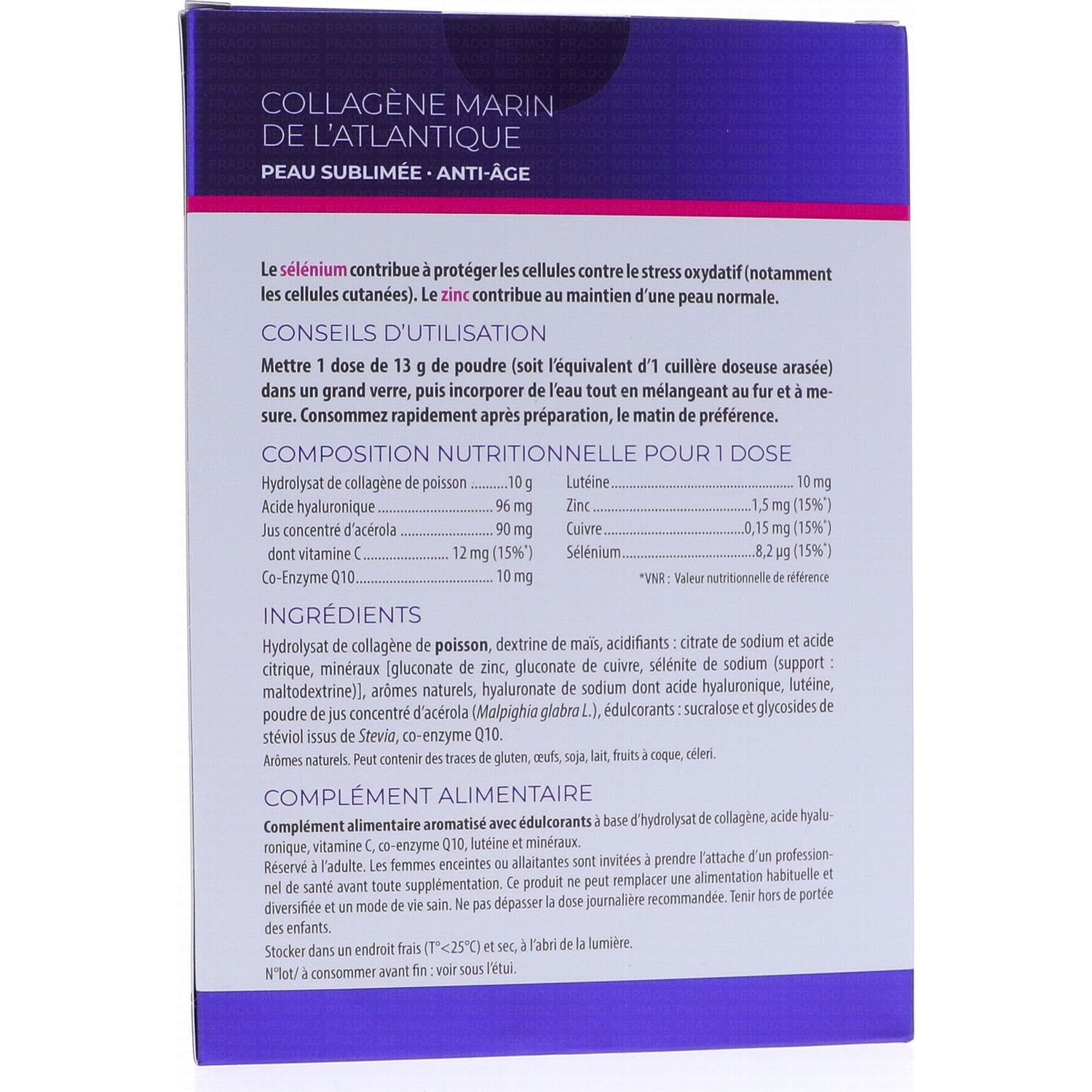Sa formule est hautement concentrée en collagène (10 grammes de collagène par jour) associé à de l'acide hyaluronique, des vitamines, du co-enzyme Q10, de la lutéine et des minéraux. Ces éléments agissent comme un bouclier anti-âge, contribuant à réduire les rides et ridules et à sublimer la peau.