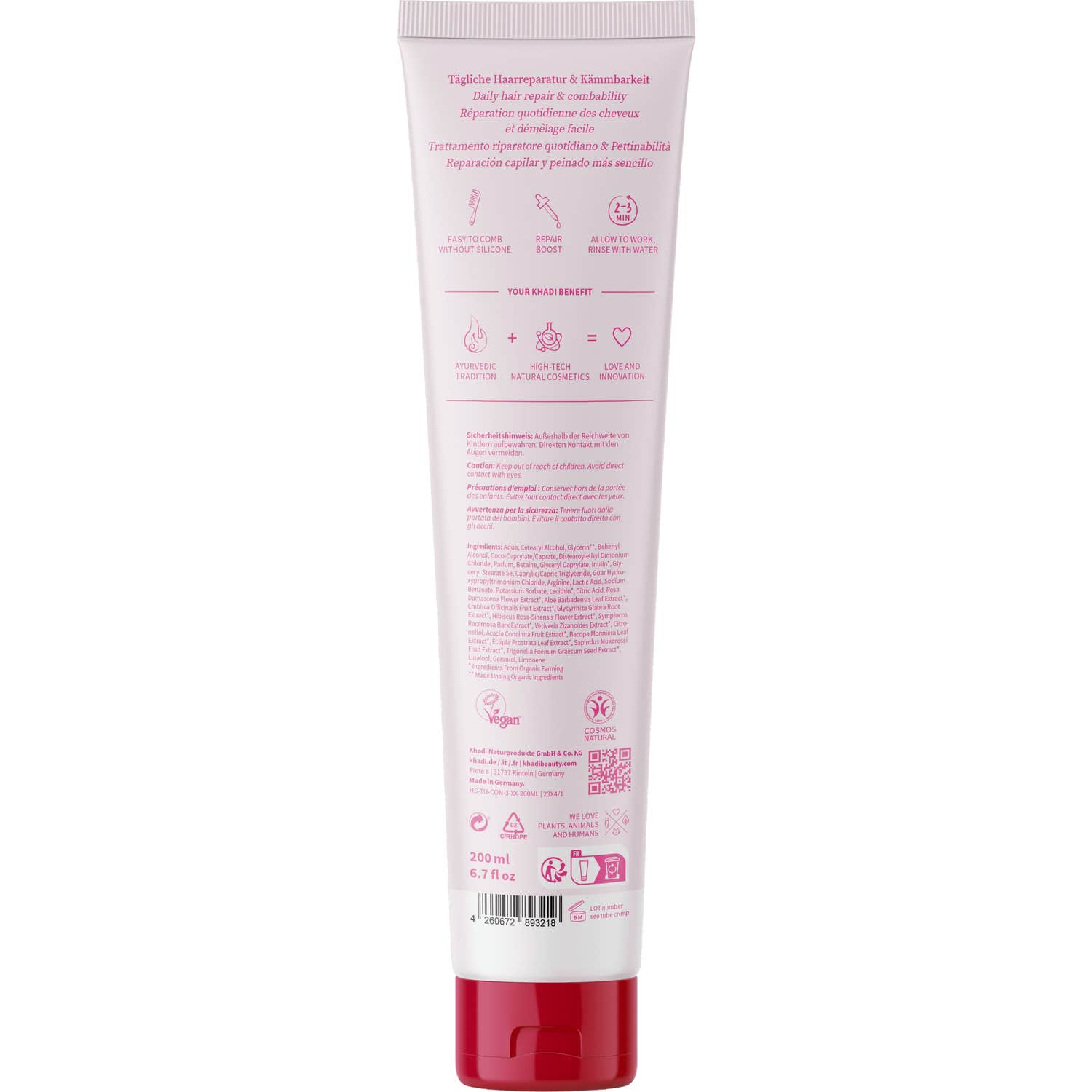 Avec un pH oscillant entre 4,5 et 5,0, cet après-shampooing s'adapte bien aux cheveux, aidant à adoucir et lisser sa surface. Son arôme de rose ajoute une touche sensorielle au moment du soin capillaire. Tous les après-shampooings de Khadi sont entièrement naturels, végans et exempts de silicones, sulfates, parabènes et autres additifs chimiques nocifs.