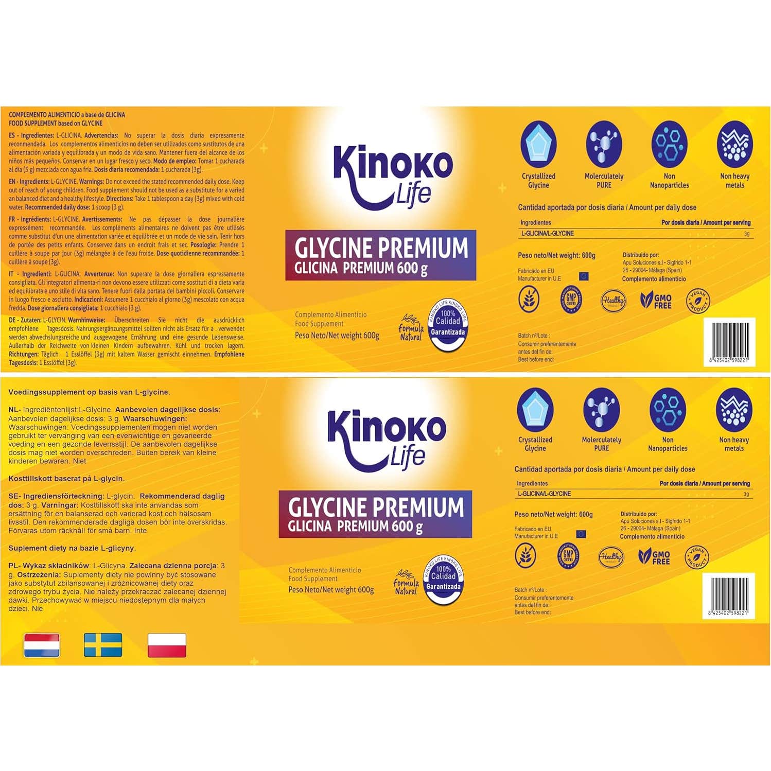 Kinoko Life Glycine Premium 600 g est un produit de haute qualité, composé de glycine cristallisée de forme moléculaire. Cet acide aminé essentiel se présente sans :