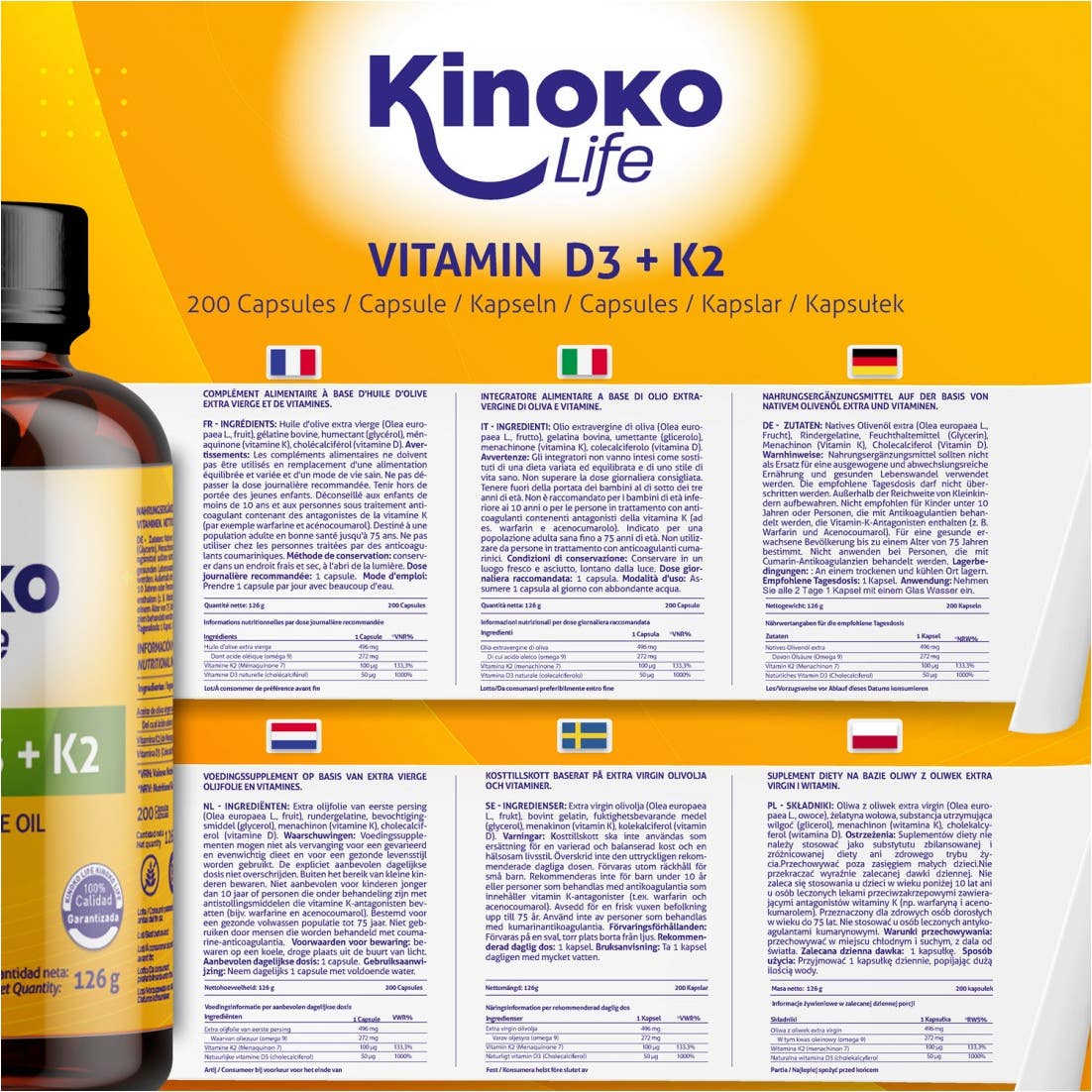 Kinoko Life Vitamine D3 + K2 avec Omega 9 est un supplément qui présente une formule avancée, composée de 200 capsules liquides. Chaque capsule contient :