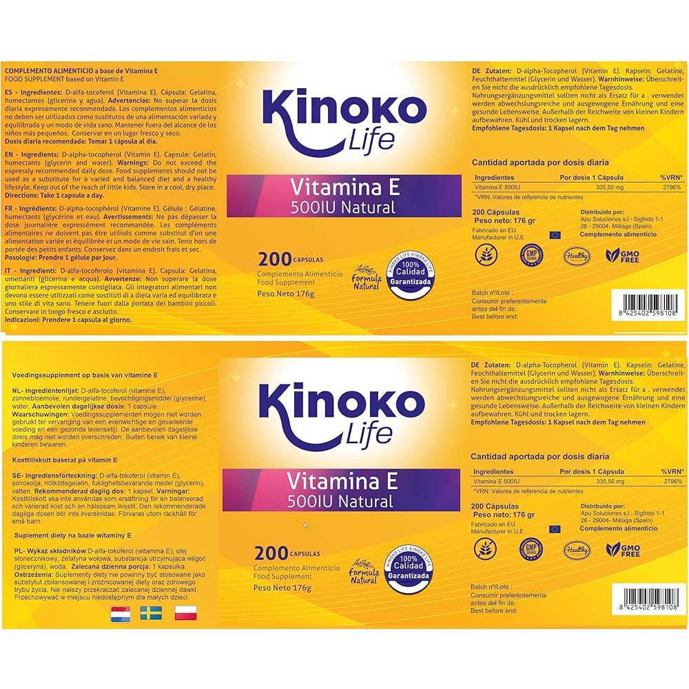 Kinoko Life Vitamine E 500UI Naturelle est un supplément qui offre une concentration supérieure en vitamine E, présentant 500 UI par capsule, au lieu des 400 UI courantes dans d'autres produits. Ce format économique comprend 200 capsules, ce qui fournit un approvisionnement pour presque 7 mois avec une dose quotidienne recommandée.