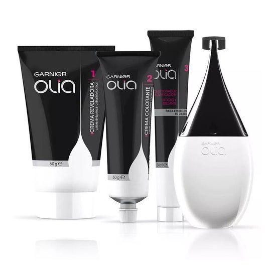 Le kit comprend une crème colorante, une crème révélatrice et un après-shampoing, ainsi qu'un applicateur ergonomique pour plus de précision. La gamme de coloration Olia offre un large choix allant jusqu'à 30 nuances.