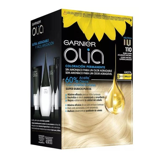Garnier Olia Super Lightening Natural Blonde 110 Shade est une coloration permanente sans ammoniaque qui couvre complètement les cheveux blancs, formulée avec 60% d'huiles naturelles.