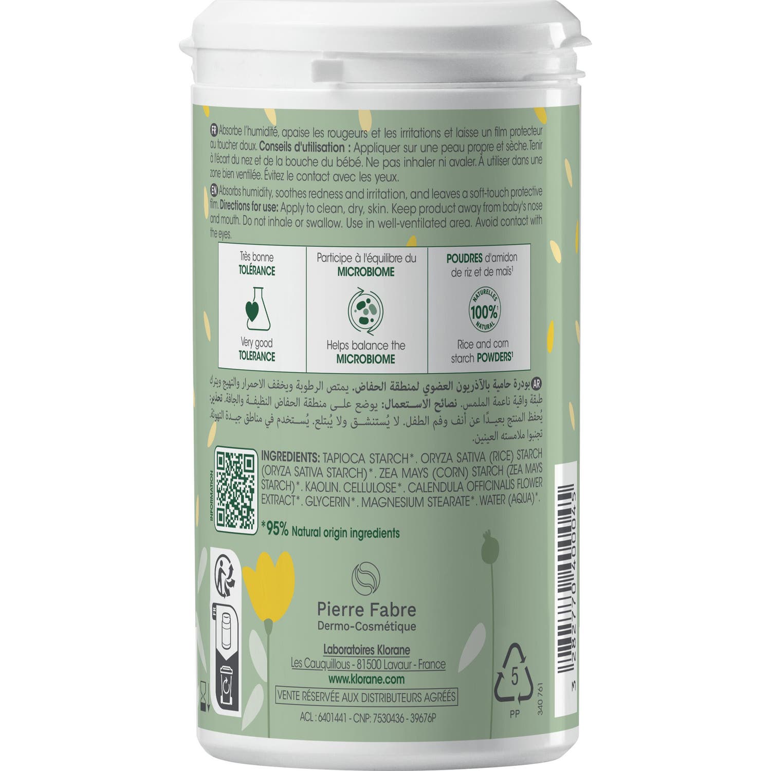 Poudre pour le change de bébé, formulée avec des poudres minérales, un extrait de calendula apaisant et un arôme doux. Produit conçu pour réduire et apaiser les rougeurs et irritations mineures dans la zone de la couche, fournit également une barrière protectrice avec un fini peau douce. Testé cliniquement sous surveillance pédiatrique. Garder la poudre loin du ner et de la bouche du bébé. Éviter le contact avec les yeux.
