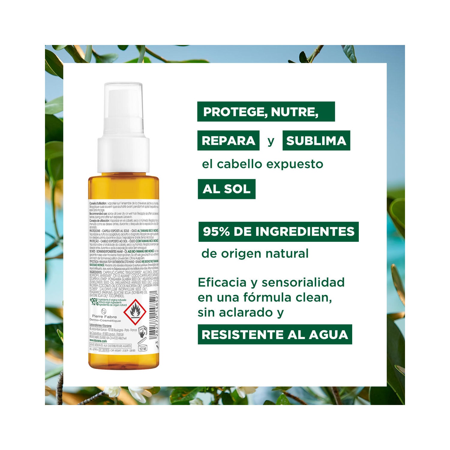 Huile capillaire indiquée pour protéger les cheveux des radiations causées par le soleil. Formulé avec des filtres UV, il agit comme un bouclier contre les agressions environnementales telles que le sable, le sel et le chlore. Contient des huiles essentielles de moniï et de tamanu, qui aident à nourrir en profondeur la fibre capillaire. Elle est résistante à l'eau et ne laisse pas de sensation grasse ou collante. Favorise la douceur et le mouvement tout en facilitant le peignage. Aucun rinçage n'est nécessaire. Convient à tous les types de cheveux.