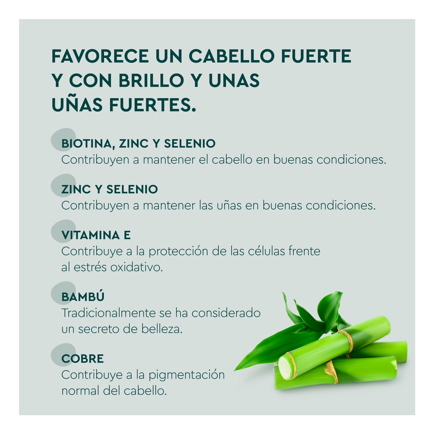 Formulé avec de la biotine, de la vitamine B3, de la vitamine E, du cuivre, du zinc, du sélénium, de la L-cystéine et du bambou, des composants qui aident à maintenir les cheveux et les ongles en bon état.