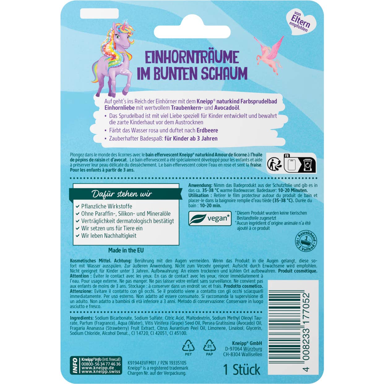 Kneipp Naturkind Bain Effervescent Amour de Licorne Fraise est un produit conçu pour te plonger dans un monde de fantaisie. Ce bain effervescent a été créé spécifiquement pour prendre soin de la peau sensible des plus petits, aidant à prévenir sa déshydratation.