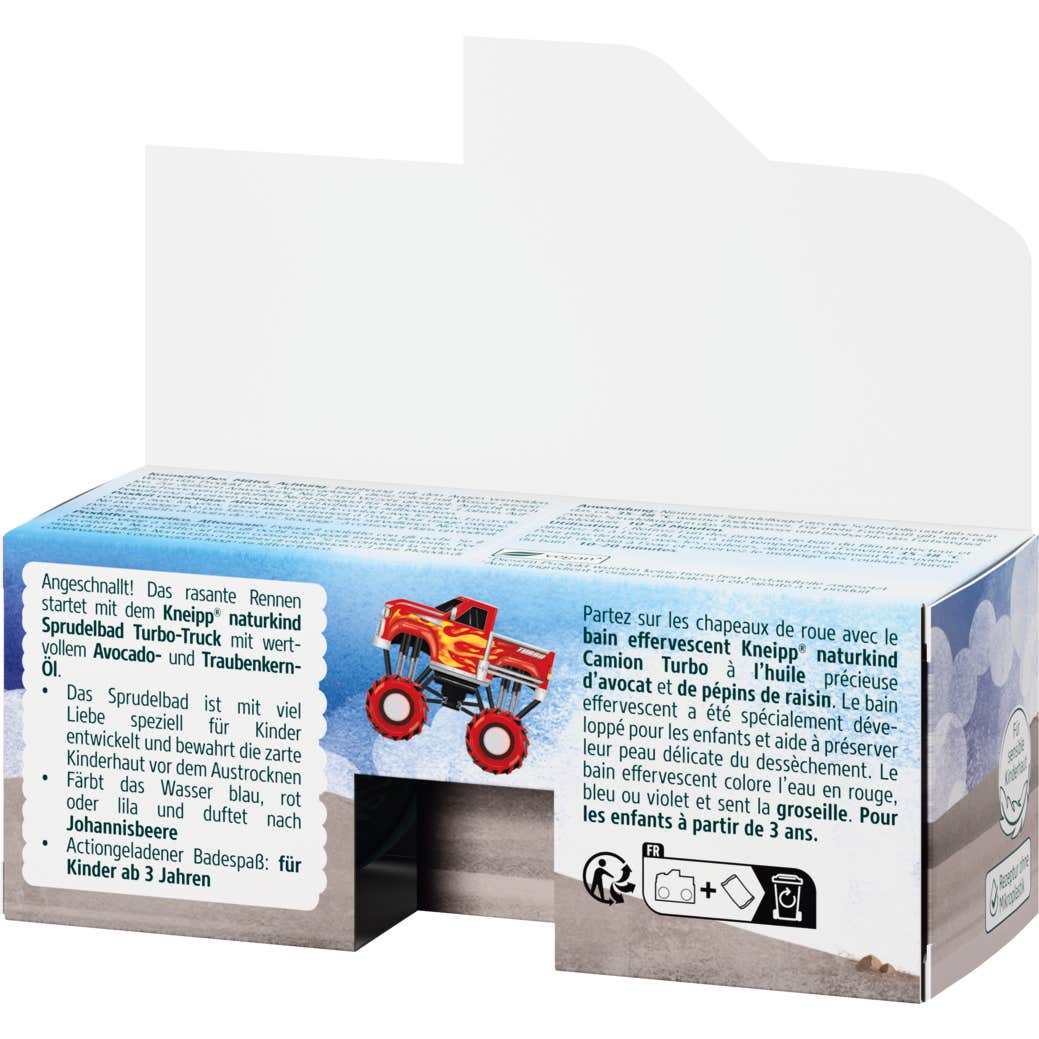 Kneipp Naturkind Bain Effervescent Camion Turbo est un produit spécialement conçu pour les enfants, qui offre une expérience de bain amusante et colorée. Avec un contenu de 100 g, ce bain effervescent est formulé avec :