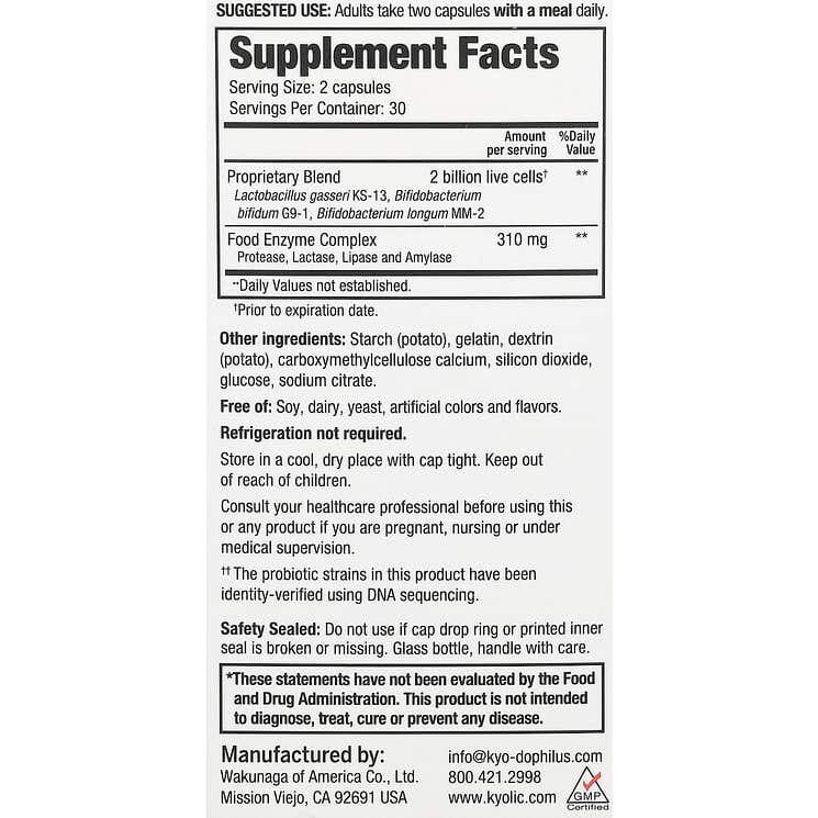 Kyo-Dophilus Eenzyme+ Probiotic se présente sous un format de 60 capsules. Ce produit contient une souche bactérienne spécifique, L. acidophilus, qui a été sélectionnée avec une attention particulière pour favoriser le bien-être du tractus intestinal.