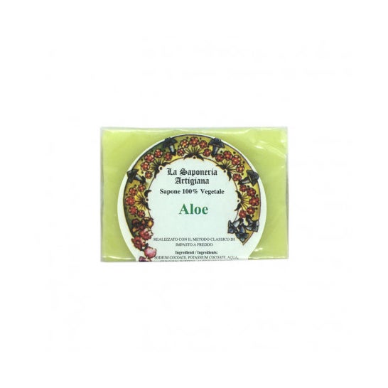 Savon artisanal à l'extrait d'Aloe vera, un produit fabriqué selon l'ancienne tradition de la méthode de la pâte froide, afin de maintenir les propriétés maximales du produit fini. Enrichi en Aloe vera, il aide à guérir et à régénérer les peaux abîmées, grâce à sa teneur en lignine. Cette enzyme pénètre la peau jusqu'à 3 fois plus que l'eau, elle est donc particulièrement utile pour régénérer les tissus.