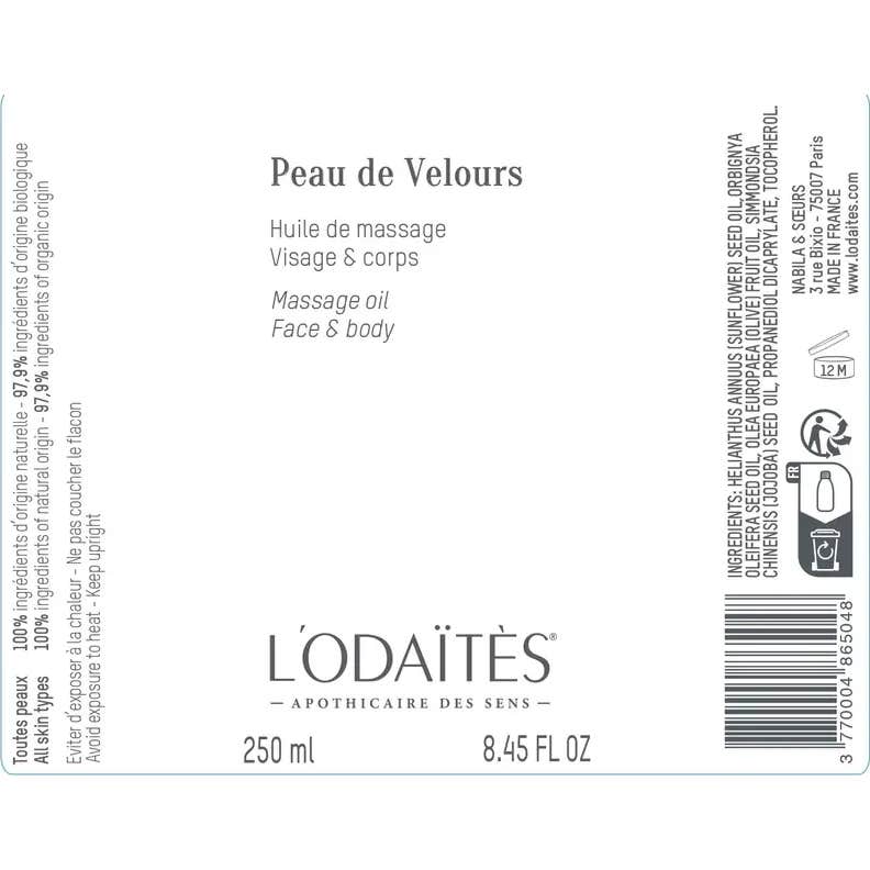 L'Odaïtès Peau de Velours Huile de Massage Visage & Corps est un produit conçu pour offrir une expérience d'hydratation et de nutrition à la peau. Sa formulation combine :