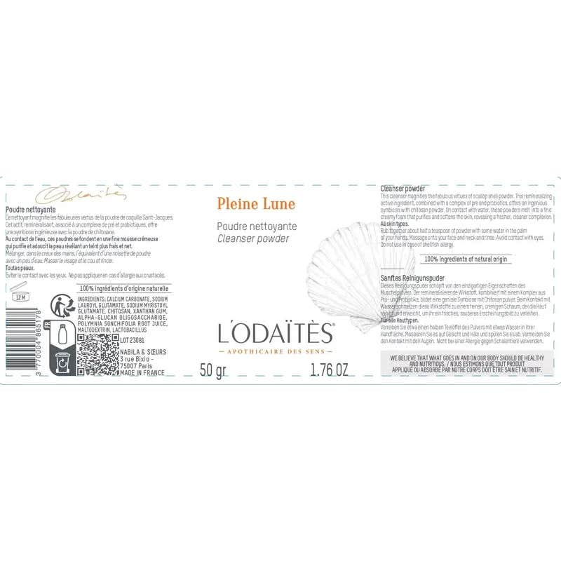 L'Odaïtès Pleine Lune Poudre Nettoyante 50 gr est un produit innovant qui se distingue par ses propriétés régénératrices grâce à la poudre de coquille de pétoncle. Ce composant actif, qui agit comme reminéralisant, est complété par un complexe de prébiotiques et de probiotiques, créant une combinaison efficace avec la poudre de chitosane.