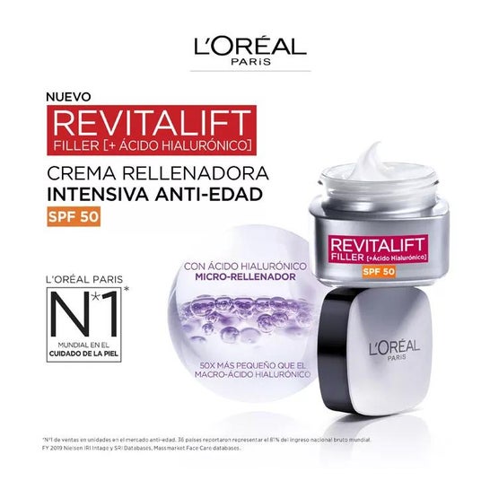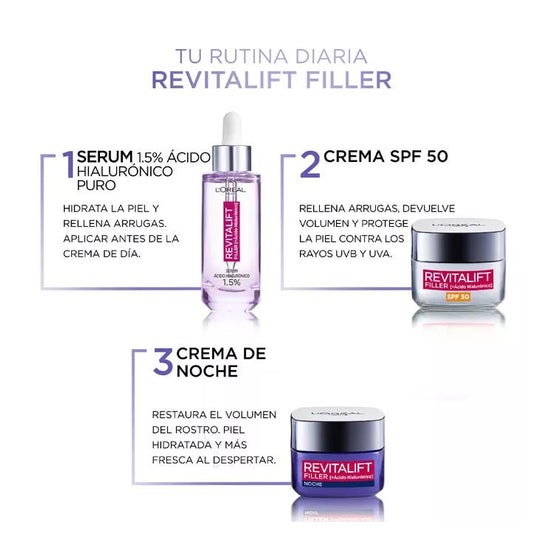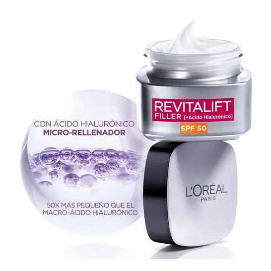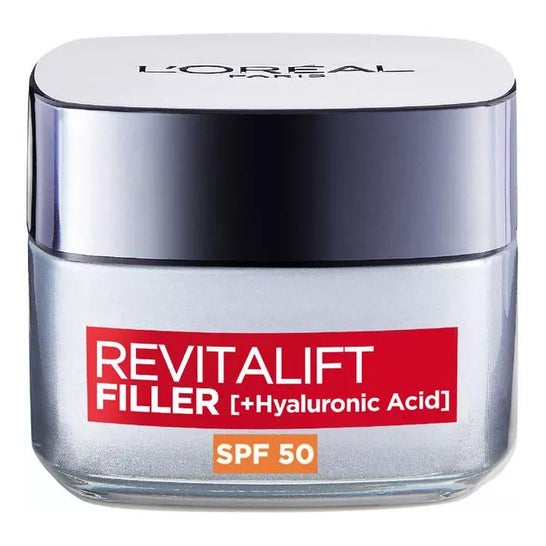 Crème pour le visage qui aide à combler les rides, grâce à sa forte teneur en acide hyaluronique. Elle contient également un SPF50 qui aide à protéger la peau contre les rayons du soleil. Hydrate et augmente l'élasticité du visage. Convient à tous les types de peau.