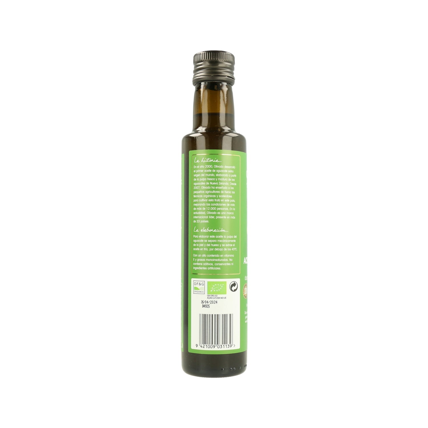 Huile d'avocat extra vierge issue de l'agriculture biologique. Son goût léger d'avocat mûr et sa texture plus dense que l'huile d'olive en font le condiment idéal à ajouter aux salades, à préparer des sauces ou à arroser les légumes cuits pour leur donner plus de goût et d'onctuosité.