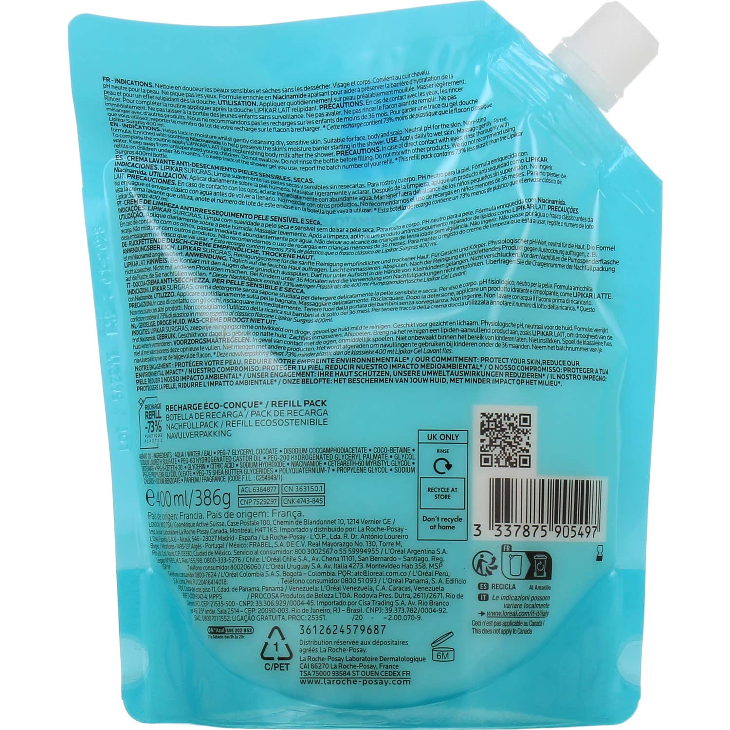 La Roche-Posay Lipikar Surgras Crème Nettoyante Recharge 400 ml est un produit conçu pour nettoyer en douceur les peaux sensibles et sèches, tant chez les bébés que chez les adultes, sans provoquer de sécheresse. Cette crème nettoyante possède une formule enrichie qui inclut :