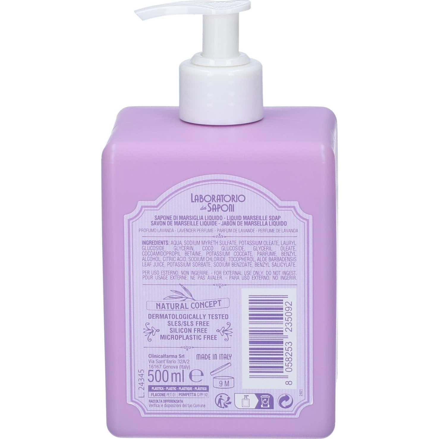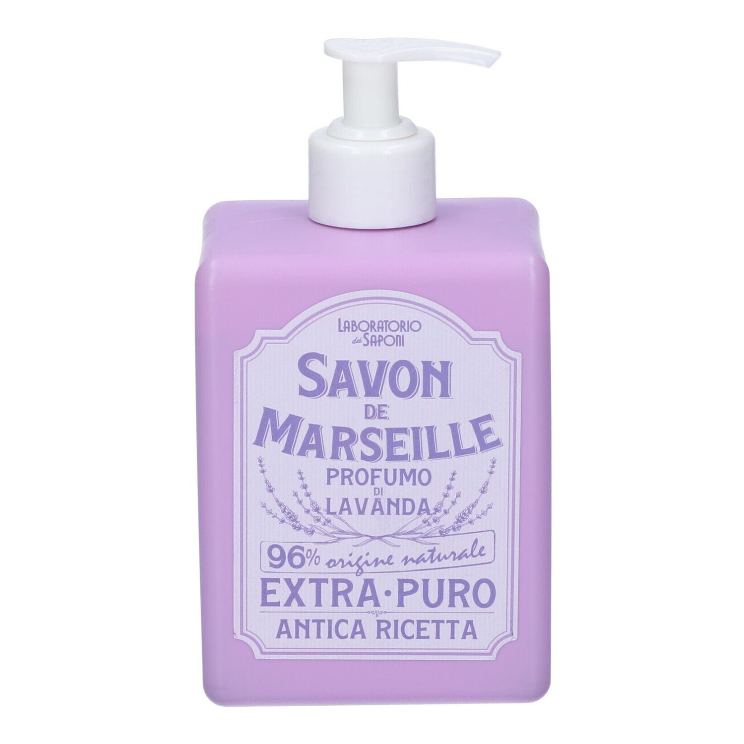 Laboratoire des Savons Savon de Marseille Lavande 500 ml pour le nettoyage quotidien des mains est un savon liquide avec distributeur pour l'hygiène quotidienne. Il comprend une formule naturelle avec des ingrédients végétaux et un parfum doux de lavande.