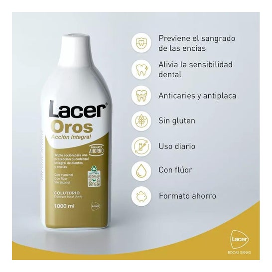Lacer Oros Mouthwash 1000ml est un bain de bouche qui aide à prévenir l'apparition de la plaque dentaire et à nettoyer en profondeur la cavité buccale, tout en protégeant les dents et les gencives. Contient 1000ml.